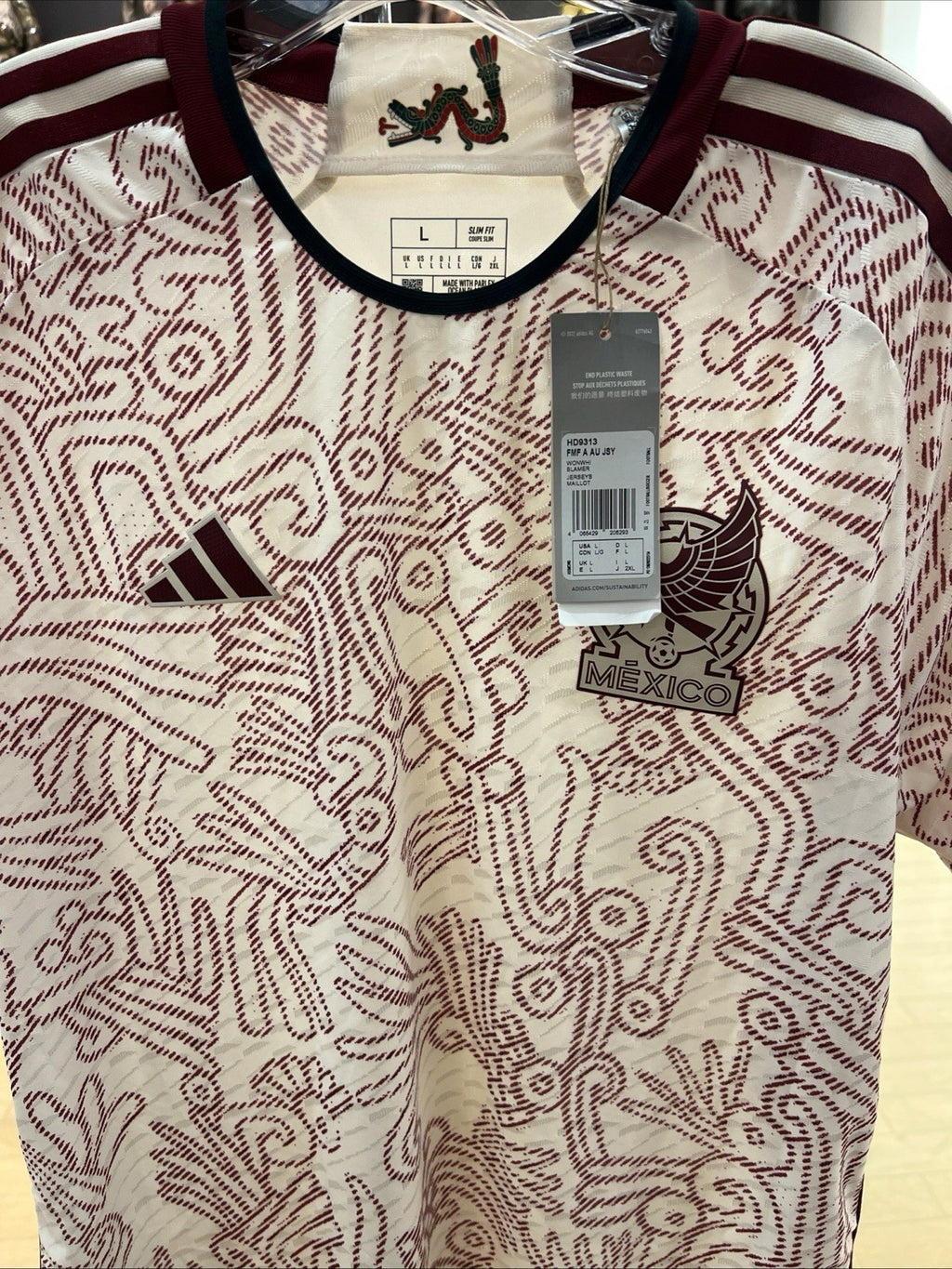 The Adidas Mexico 2022 Away Soccer Jersey in size L is a stylish and high-quality athletic top suitable for casual wear or activewear. Made from 100% recycled polyester, this ivory-jersey features a graphic print design with the Adidas logo as accents. The crew neck and short sleeves provide a comfortable fit, while the pullover closure allows for easy wear. This limited edition jersey is perfect for gym & training sessions or casual outings during the spring, summer, or fall seasons. With its slim fit and lightweight fabric, this jersey is a must-have for any man's wardrobe.
