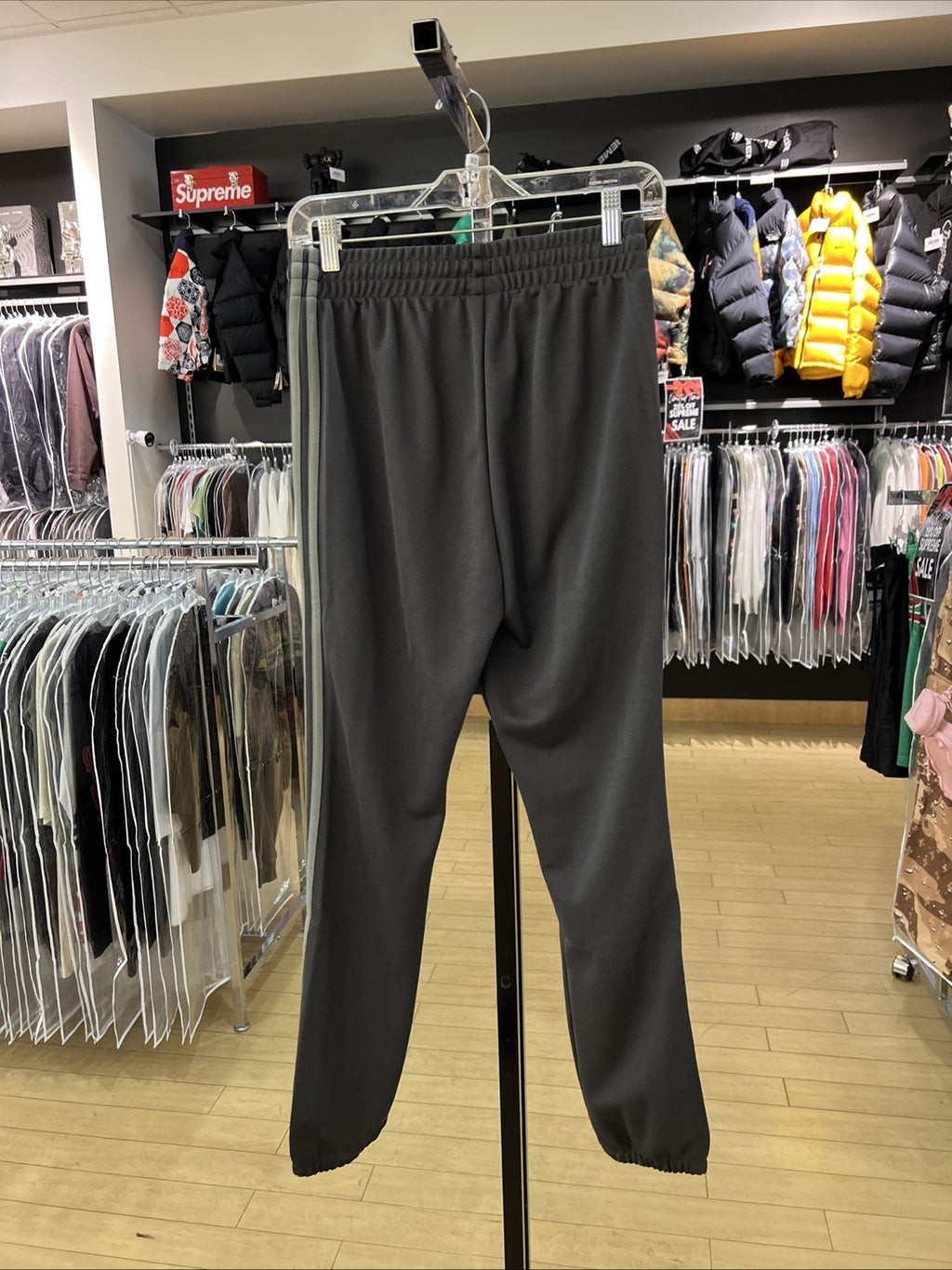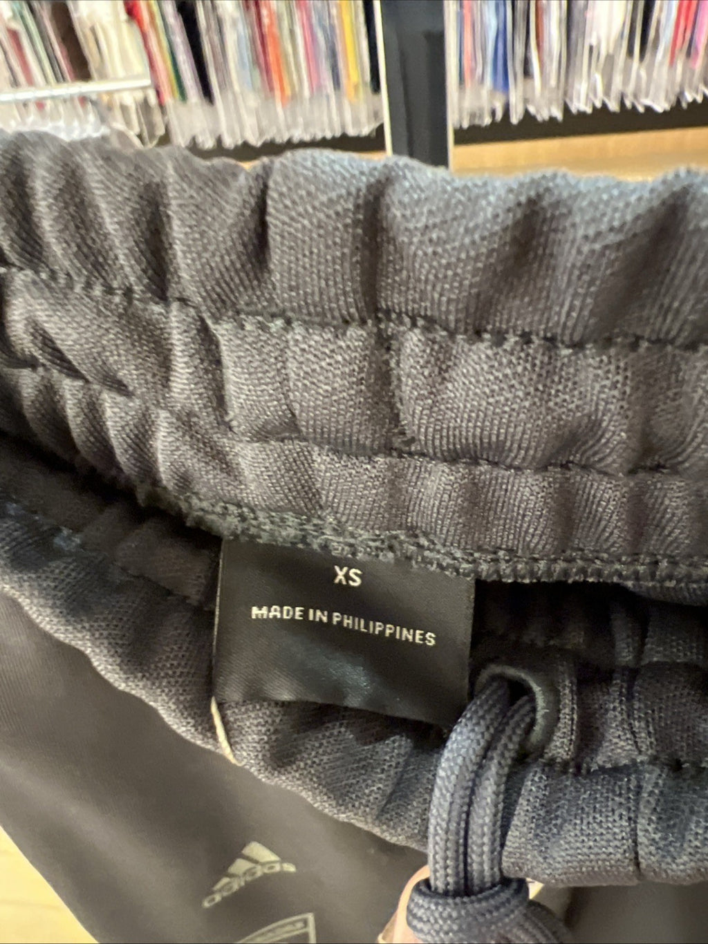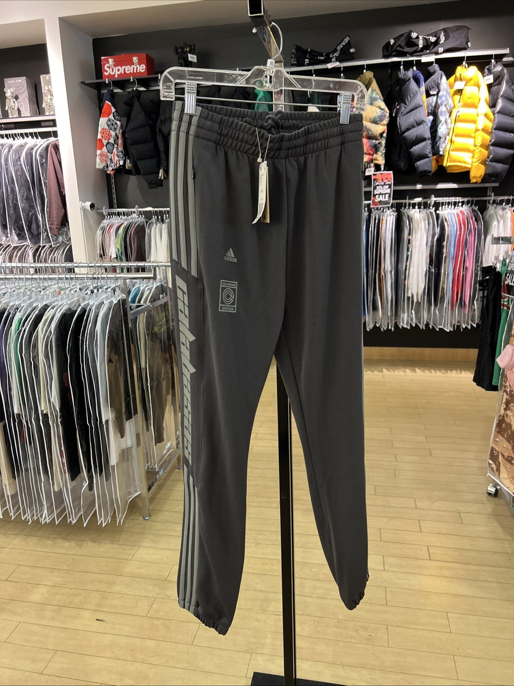 The product is a pair of Adidas Yeezy Adidas Calabasas DY0567 Ink Gray Pants in size XS. These casual pants feature a tie and drawstring closure, a logo accent, and a slash pocket design. Made of polyester with a 32-inch inseam, they are designed with a regular fit and the iconic Adidas brand. Perfect for men looking for stylish and comfortable sweatpants.