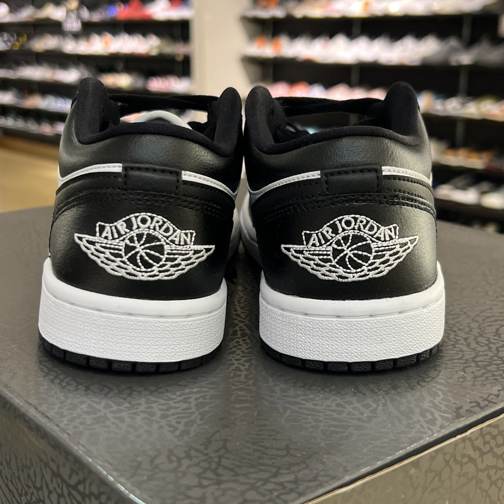 The product is a women's Air Jordan 1 Low Panda sneaker in size 7.5. This shoe features a low top silhouette, white colorway with leather upper material, and is part of the Air Jordan product line. The release year is 2023, and the style code is DC0774-101. It is a stylish and athletic shoe designed for women who are fans of the Jordan brand and looking for a trendy and comfortable footwear option. Box is missing lid.