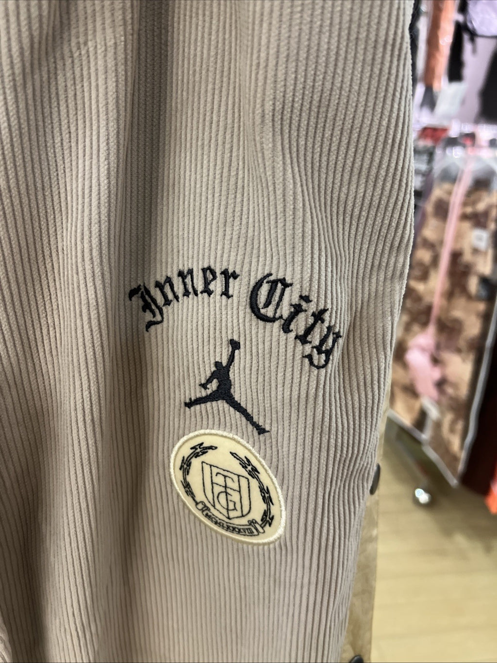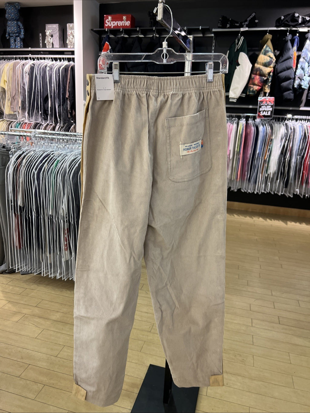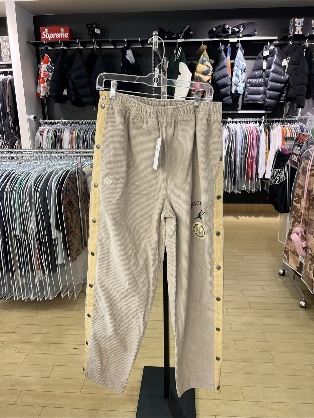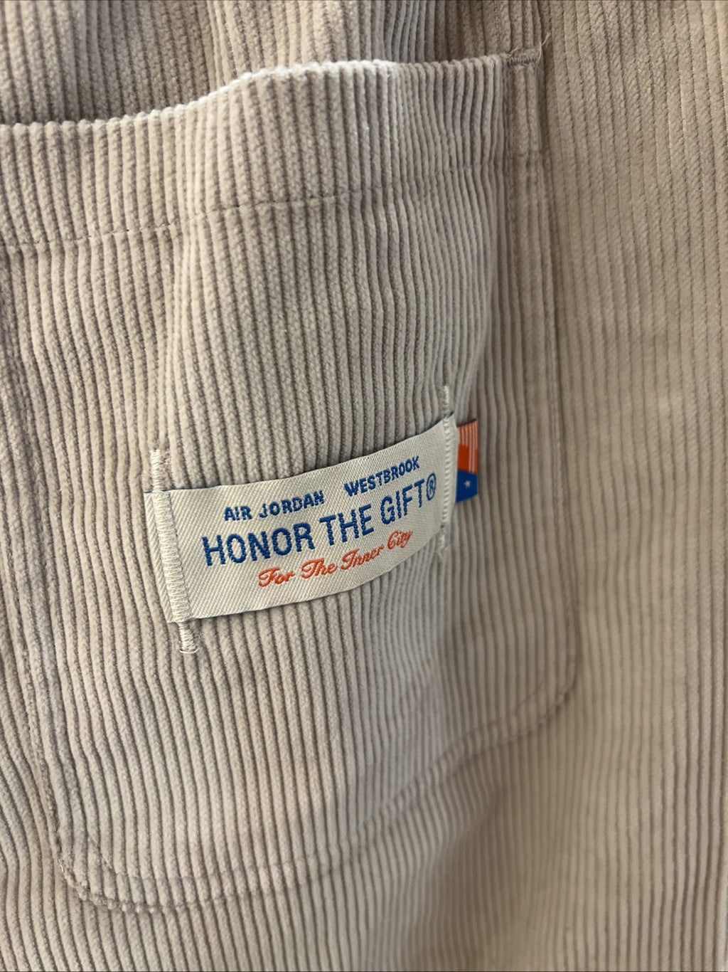The Air Jordan x Russell Westbrook Honor the Gift Pants in size M are a stylish and casual addition to any man's wardrobe. The Nike logo accents add a touch of classic style, while the straight leg fit and slash pockets offer both fashion and functionality. Perfect for the winter, fall, or spring seasons, these khaki-style pants are machine washable for easy care. Celebrate the Honor the Gift collection with these trendy and versatile pants.