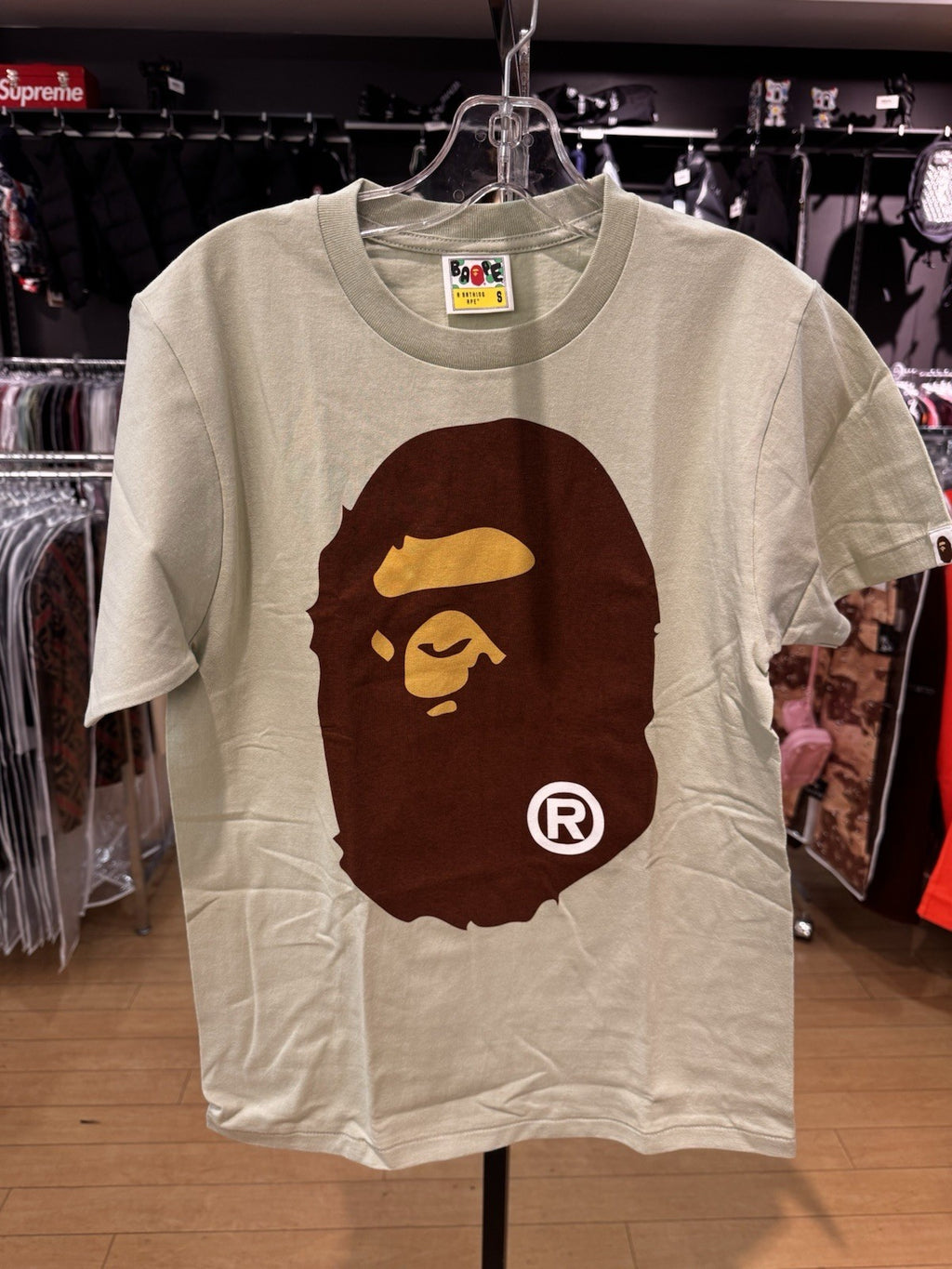 The Bape Big Ape Head Tee in green, size small, is a men's t-shirt featuring a unique design that is characteristic of the HEAD brand. This t-shirt is a stylish addition to any man's wardrobe, showcasing a bold and eye-catching graphic on the front. The green color adds a pop of color to any outfit, making it a versatile piece that can be dressed up or down for any occasion. The small size ensures a comfortable and flattering fit for the wearer.