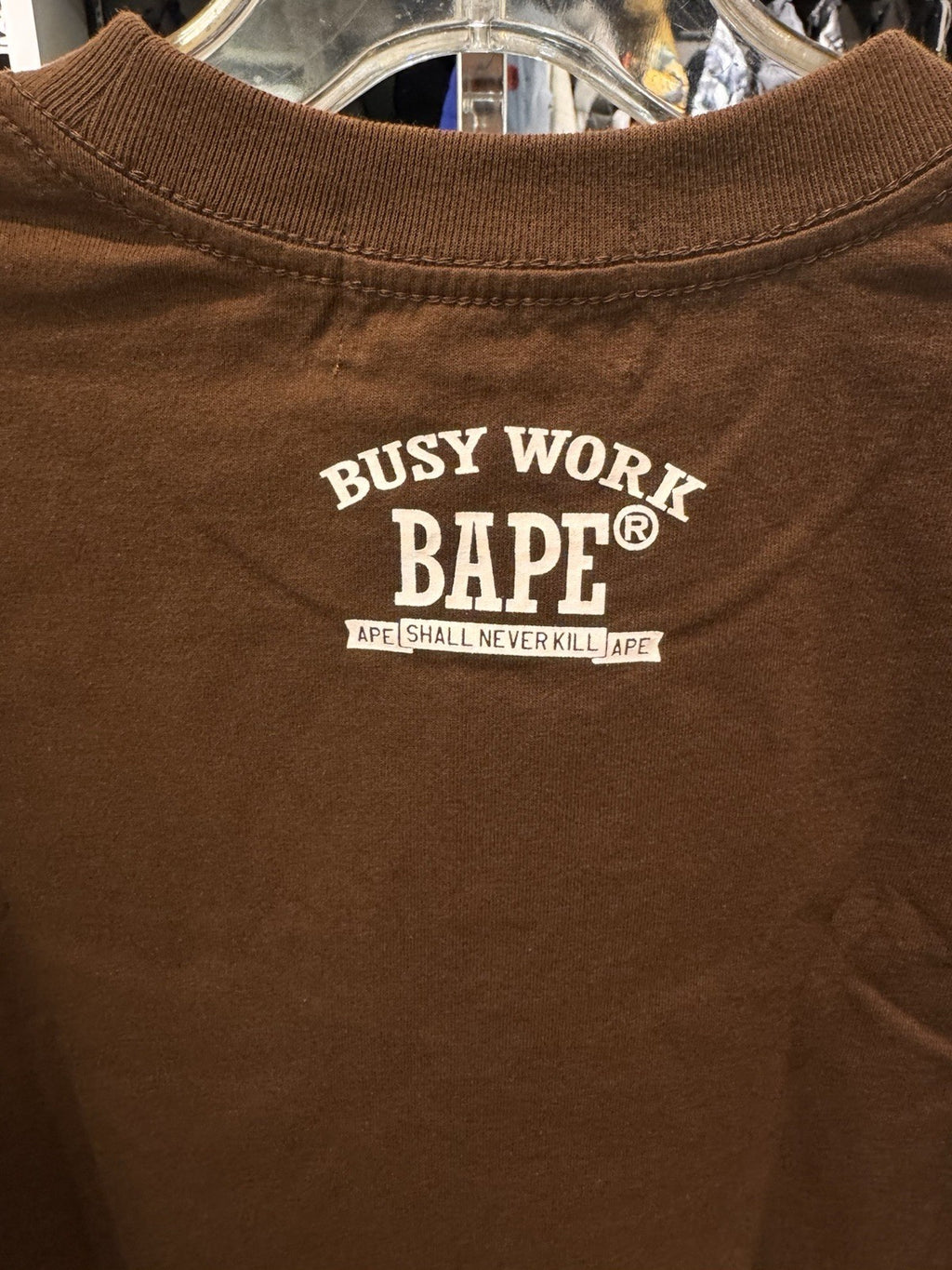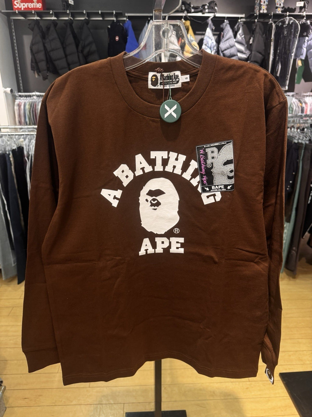 The BAPE Mad Face College Long Sleeve Tee in Brown, size Small, is a stylish and trendy men's shirt featuring a unique college theme. Made by the well-known brand BAPE, this regular fit t-shirt has long sleeves, making it perfect for cooler weather. The brown color adds a touch of sophistication to the overall design, making it a versatile piece that can be dressed up or down for any occasion.