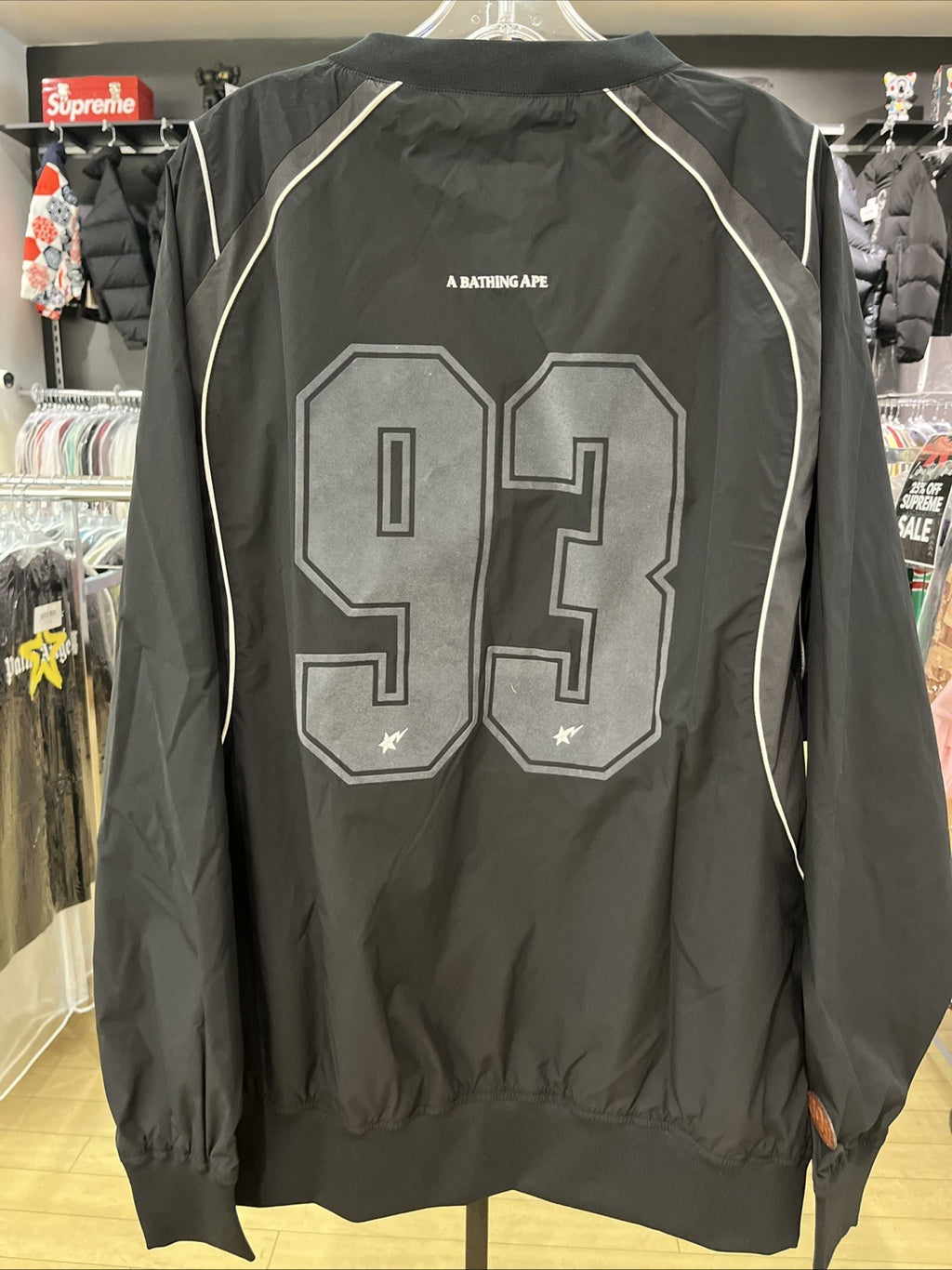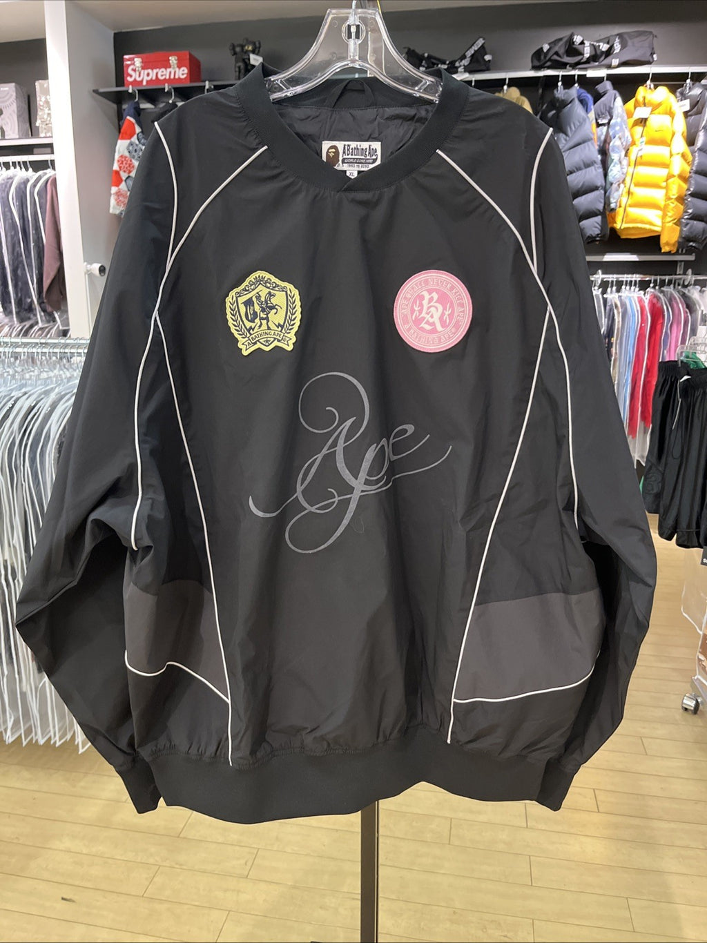 The Bape Multi Logo Relaxed Fit Pullover in size XL is a stylish windbreaker jacket designed for men. Made from durable nylon with a soft polyester lining, this black jacket features the iconic A Bathing Ape logo accents. The relaxed fit and regular size type ensure a comfortable and fashionable look for any casual outfit. Perfect for layering in transitional weather, this pullover combines streetwear style with functional jacket design.