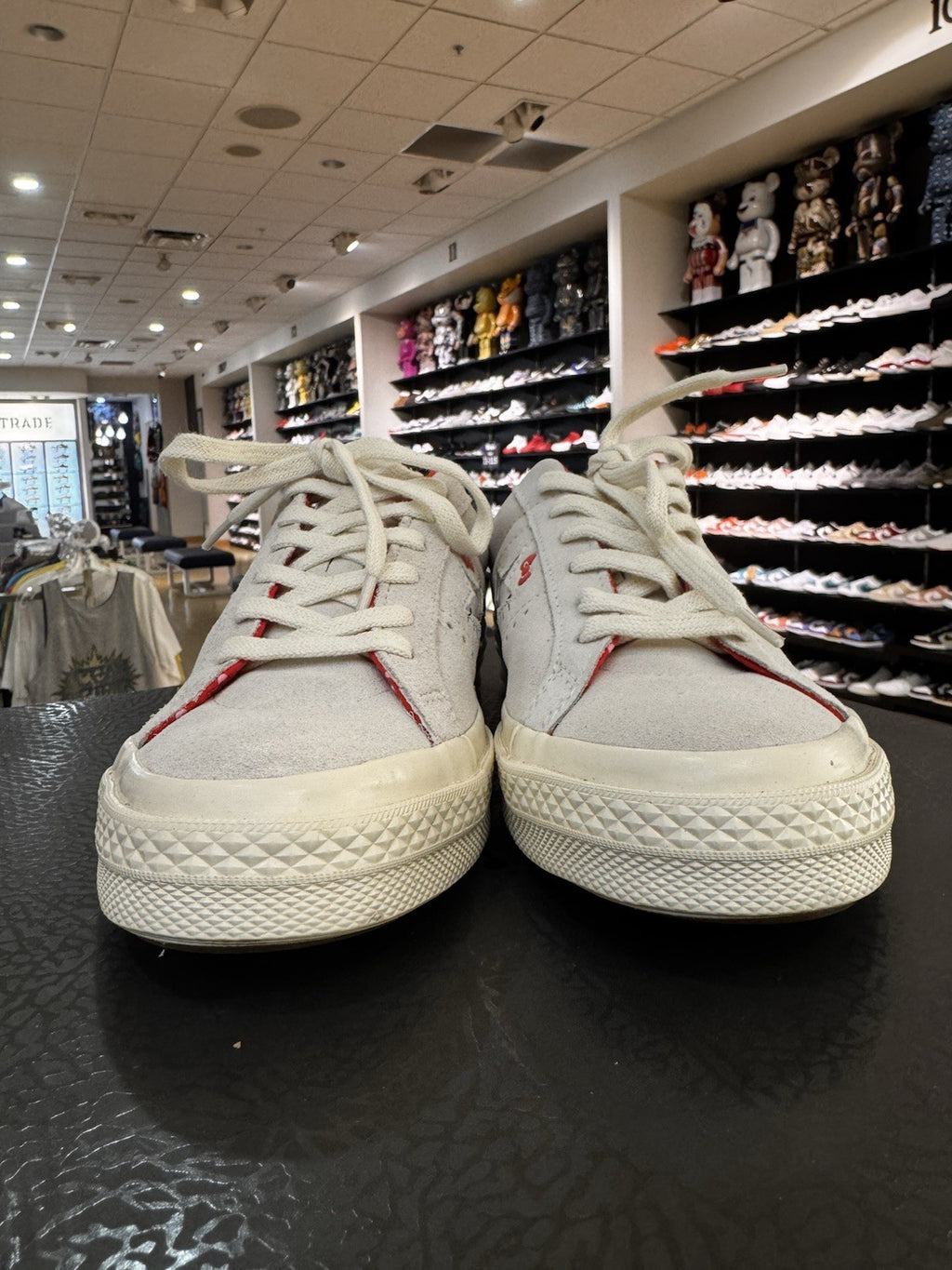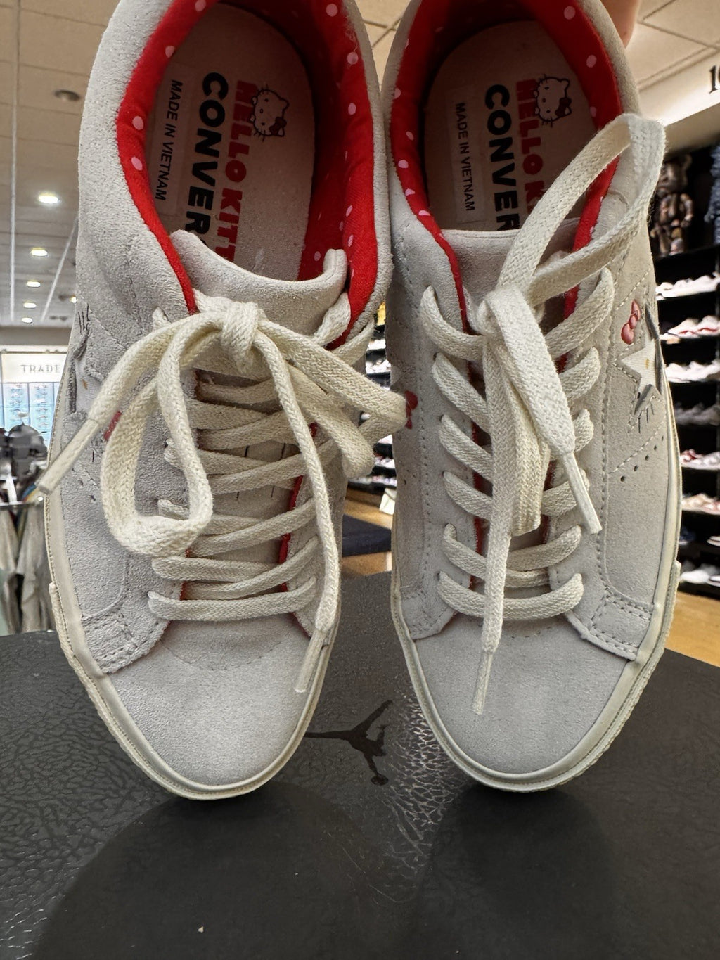 The product is a Converse One Star Ox Hello Kitty sneaker in a grey color, featuring the popular character Hello Kitty. This athletic shoe is designed for women and falls under the US shoe size 5.5. The Converse One Star Ox model incorporates a star theme, making it a stylish and fun addition to any casual outfit. The sneaker is part of the Converse One Star product line, known for its quality and comfort.