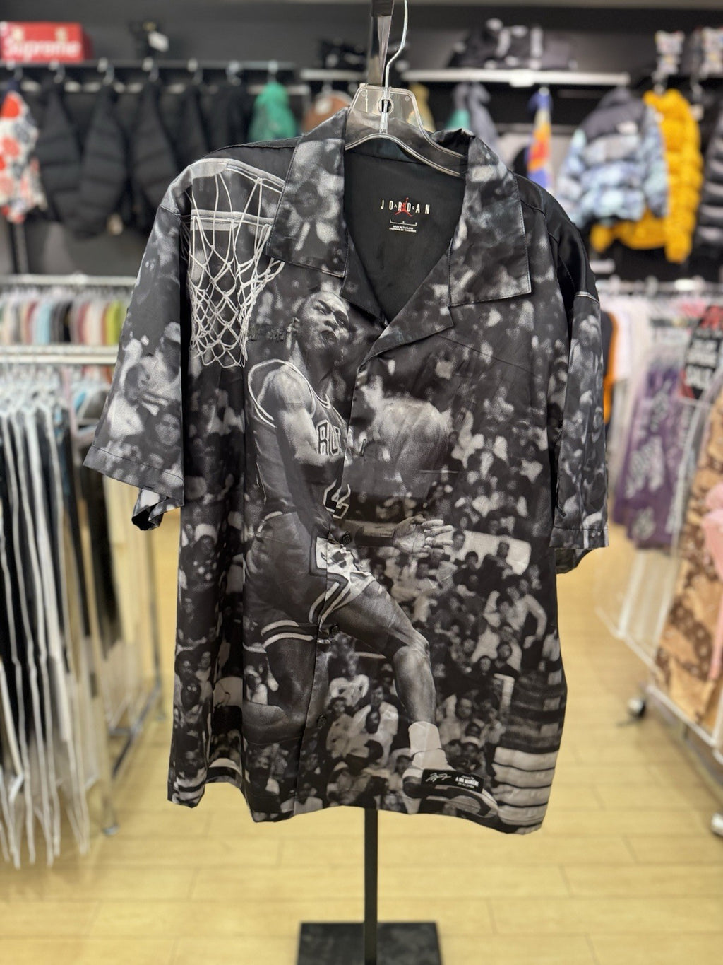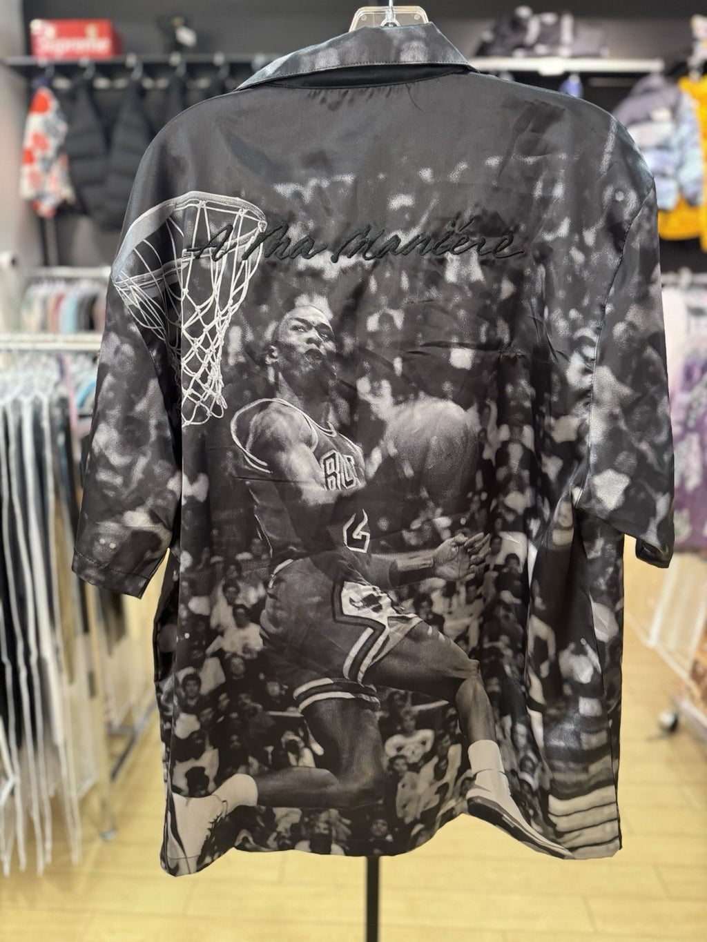 The product is a Jordan X A Ma Maniere AJ2 short sleeve top shirt in black, size large. This shirt is designed for men and features a regular fit. It is a stylish and comfortable addition to any wardrobe, combining the iconic Jordan brand with a contemporary design from A Ma Maniere. Perfect for casual wear or to make a fashion statement, this shirt is a versatile piece that can be dressed up or down for any occasion.