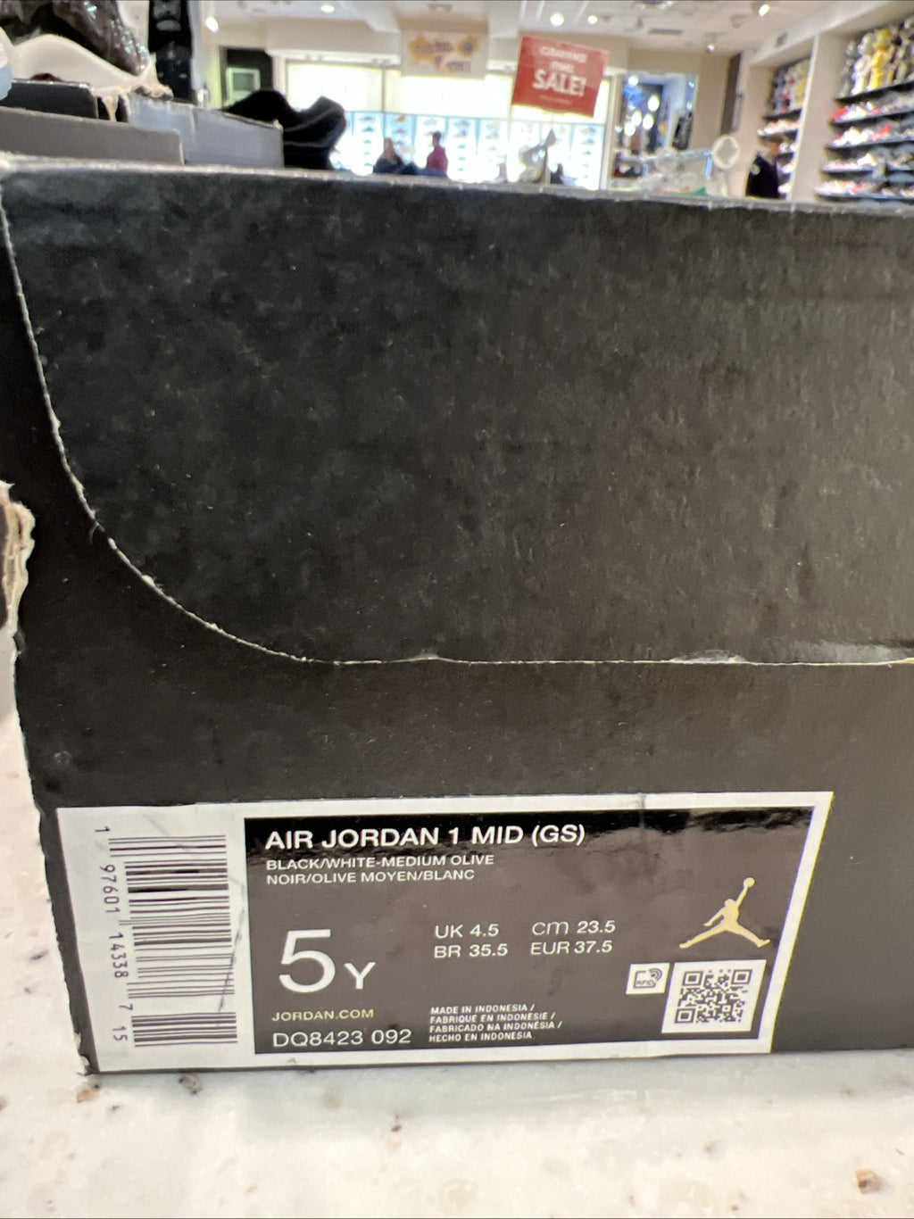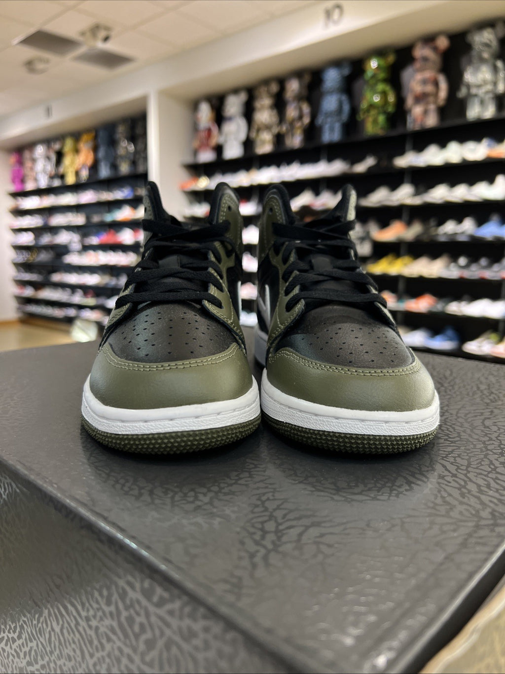 The Nike Air Jordan 1 Mid (Black/Medium Olive/White) in size 5Y is a stylish athletic sneaker designed for boys. Made by Nike, a reputable brand known for quality sports footwear, this shoe features a combination of black, medium olive, and white colors that give it a unique and eye-catching look. With a comfortable fit and durable construction, this sneaker is perfect for active kids who want to stay stylish while on the move.