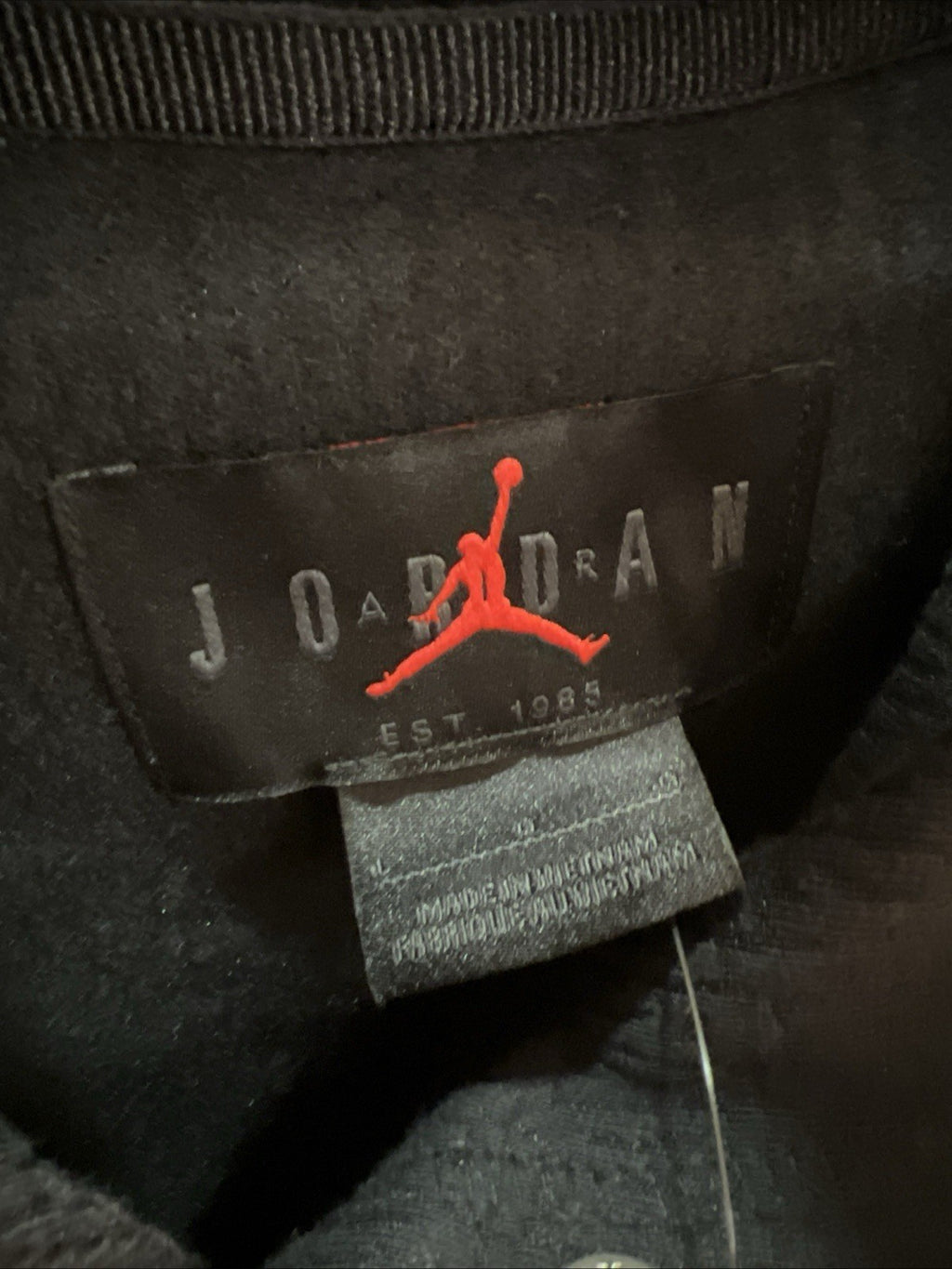 The Nike Air Jordan A MA MANIERE JACQUARD SWEATSHIRT in Black, size L, is a stylish pullover sweatshirt featuring a hooded neckline and snap closure. Made of a blend of polyester, cotton, and elastane, this knit fabric sweatshirt is designed with button, embroidered, and logo accents. The solid black color and designer character make it a fashionable choice for those who appreciate the Chicago Bulls and the Triple Black aesthetic. With its machine washable care instructions and regular fit, this sweatshirt is perfect for activities like gym training, cross training, and basketball.