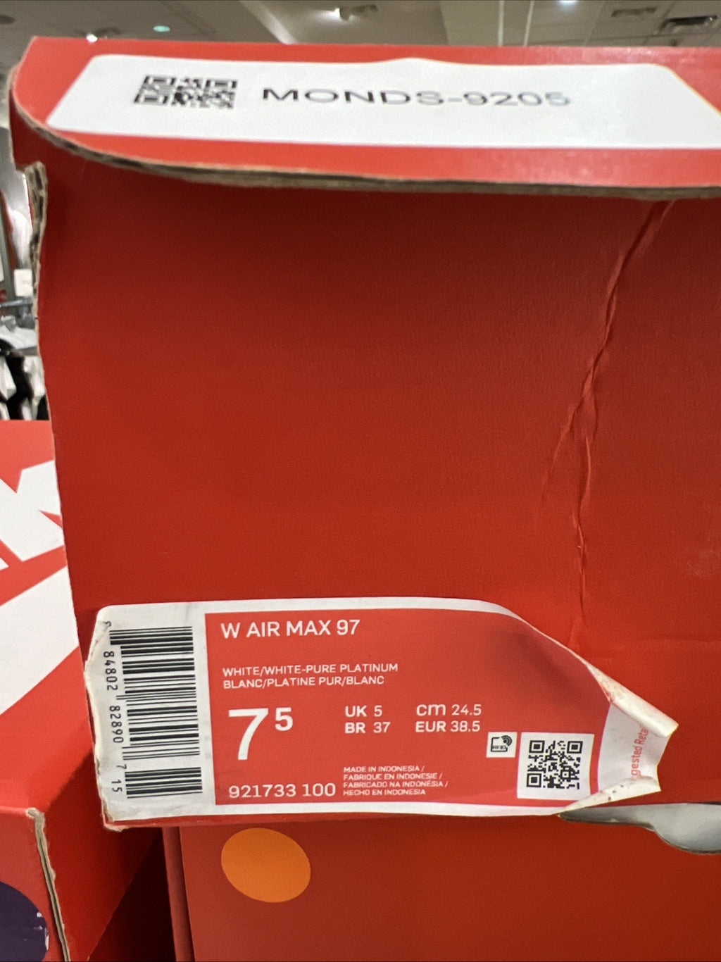 The Nike Air Max 97 Triple White Platinum Women's sneakers in size 7.5 are a stylish and comfortable choice for athletic activities. These low-top sneakers feature a clean white color with Nike logos as accents, making them a versatile option for gym workouts or running. The rubber outsole provides traction, while the synthetic upper material ensures durability. With adjustable features and a focus on comfort, these Nike Air Max 97 sneakers are a great addition to any woman's athletic shoe collection.