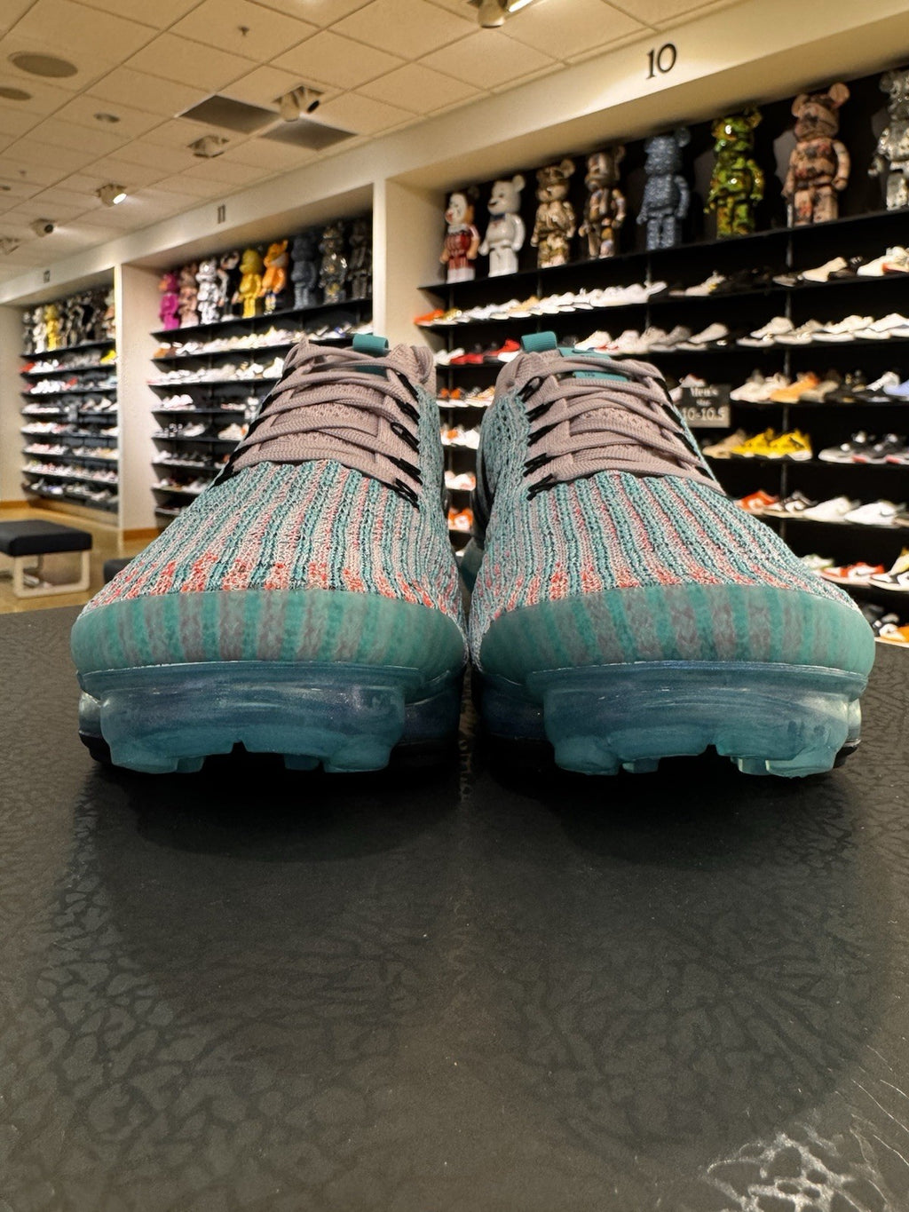 The Nike Air VaporMax Flyknit 3 South Beach sneakers in women's size 12/10.5M are a stylish and comfortable option for athletic wear. Featuring Nike's signature Air VaporMax technology, these sneakers provide cushioning and support for various activities. The blue colorway adds a vibrant touch to the design, while the FlyKnit upper material ensures a lightweight and breathable feel. Released in 2019 as part of the Nike Air VaporMax product line, these sneakers combine style and performance for a versatile shoe option for women on the go.