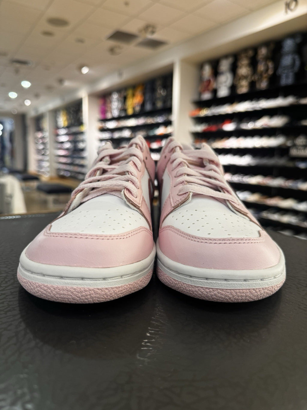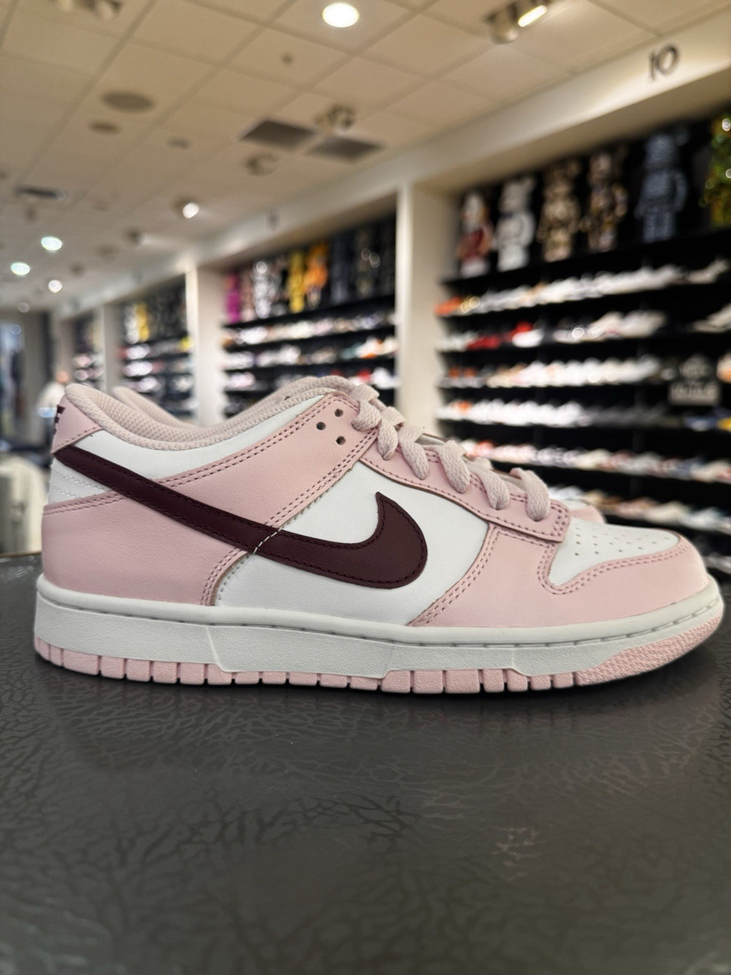 The product is a pair of Nike Dunk Low sneakers in pink foam color with red and white accents. Designed for athletic use, these unisex kids' shoes are a size 7Y. The foam insole offers comfort and support for active kids, making them both stylish and practical for everyday wear. Perfect for adding a pop of color to any outfit, these Nike Dunks combine quality construction with a trendy design that is sure to be a hit with both kids and parents alike.