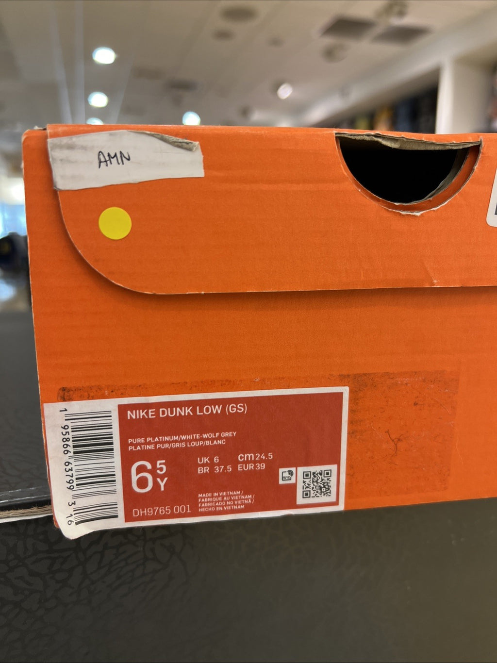 The product is a pair of Nike Dunk Low sneakers in the Pure Platinum Wolf Grey White colorway, specifically designed for teens in a low-top style. The shoe features a US size 6.5Y and UK size 6, with a sleek gray color that combines white accents. With its iconic Nike Dunk model and athletic design, these shoes are a stylish and comfortable option for young sneaker enthusiasts looking for a versatile and trendy footwear option.