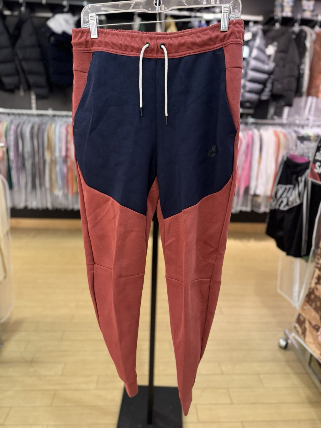 The Nike Sportswear Men's Tech Fleece Joggers in Cedar/Obsidian are a stylish and versatile addition to any man's wardrobe. These slim-fit sweatpants feature a drawstring closure, elastic waist, and tapered leg style for a modern look. Made from a blend of cotton and polyester, they are easy to care for and machine washable. With features like a media pocket, zip pocket, and pockets for convenience, these joggers are perfect for travel, activewear, and casual occasions year-round. The solid color pattern and Nike branding add a touch of athleisure style to this comfortable and practical garment.
