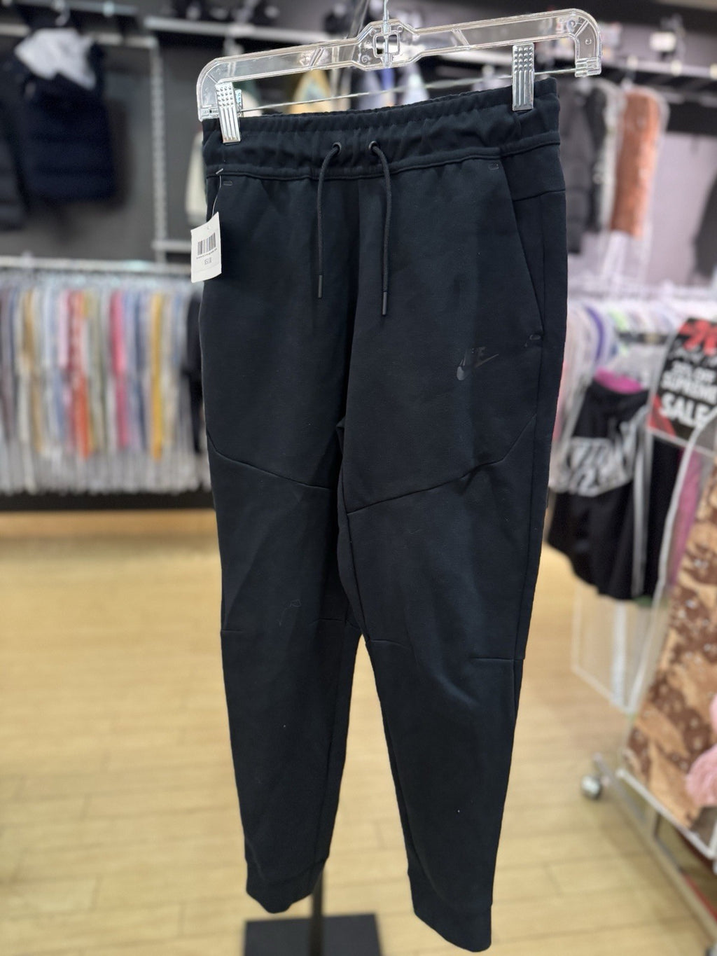 The Nike Sportswear Tech Fleece Big Kids' Pants in size M+ are perfect for active boys. Made from a blend of cotton and polyester, these black pants feature a drawstring closure for a comfortable fit. The tapered leg style and jogger design make them both stylish and functional for various activities like basketball, running, and climbing. With pockets and the Nike logo, these pants are a versatile choice for the winter, fall, and spring seasons. Easy to care for with machine washable instructions, these athletic pants are a must-have for young athletes.