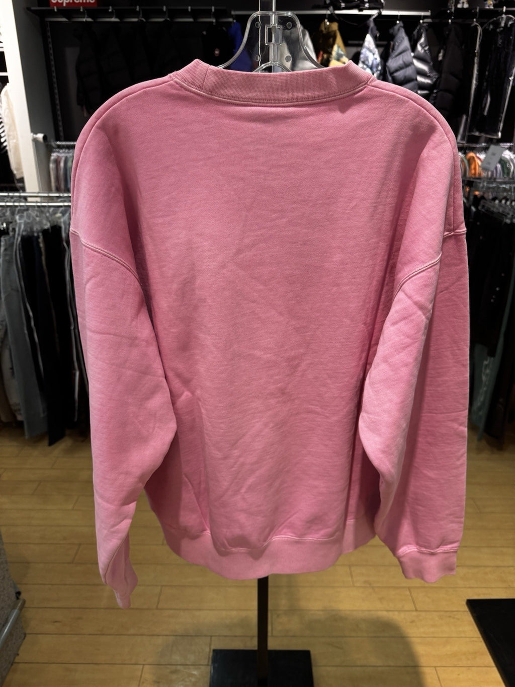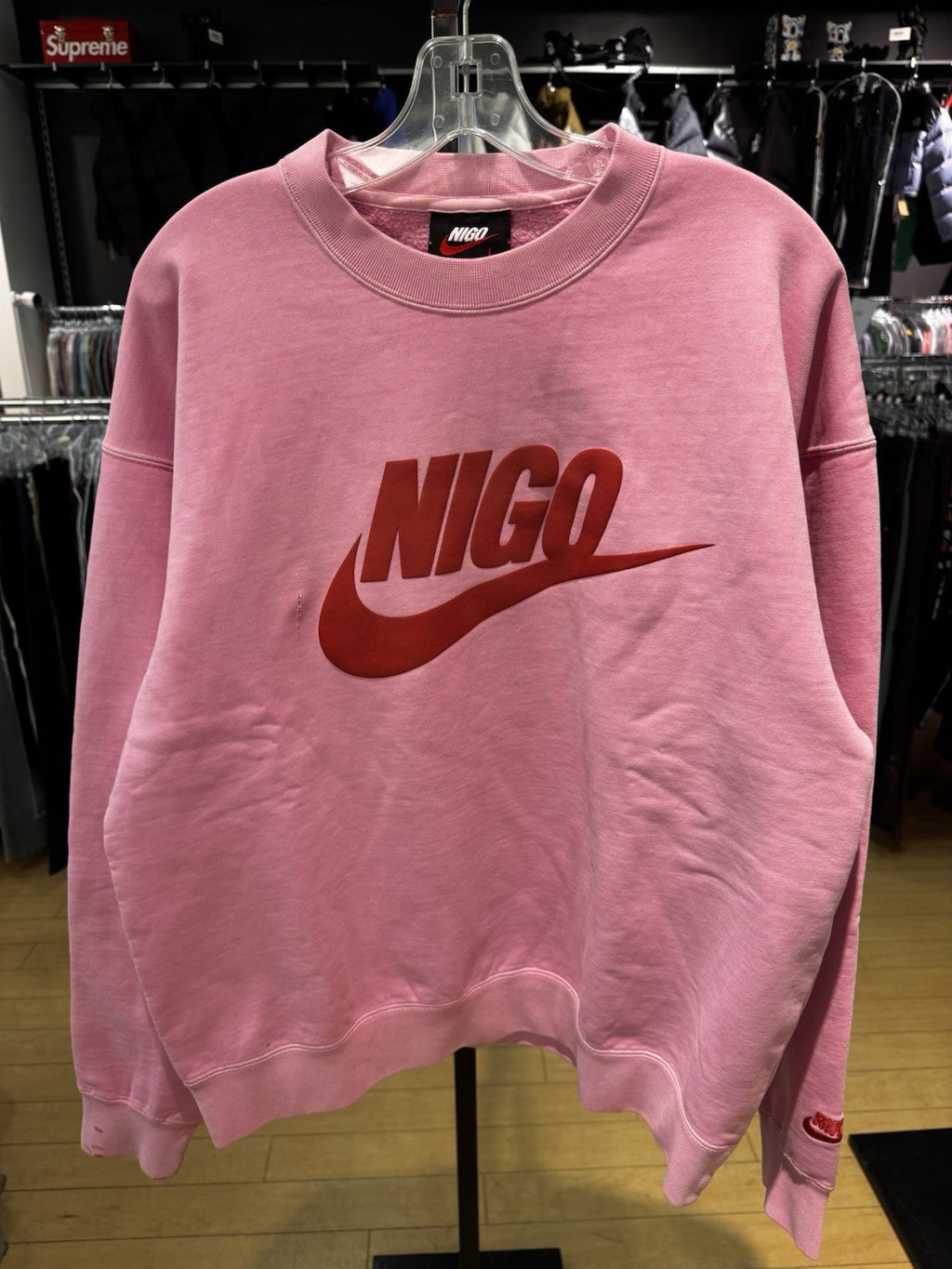 The product is a Nike X Nigo NRG Fleece Crew Sweatshirt in a color of pink. This sweatshirt is designed for men and features a cozy fleece fabric type. The size of the sweatshirt is identified as large. This collaboration between Nike and Nigo offers a stylish and comfortable activewear option for men, perfect for casual wear or workouts.