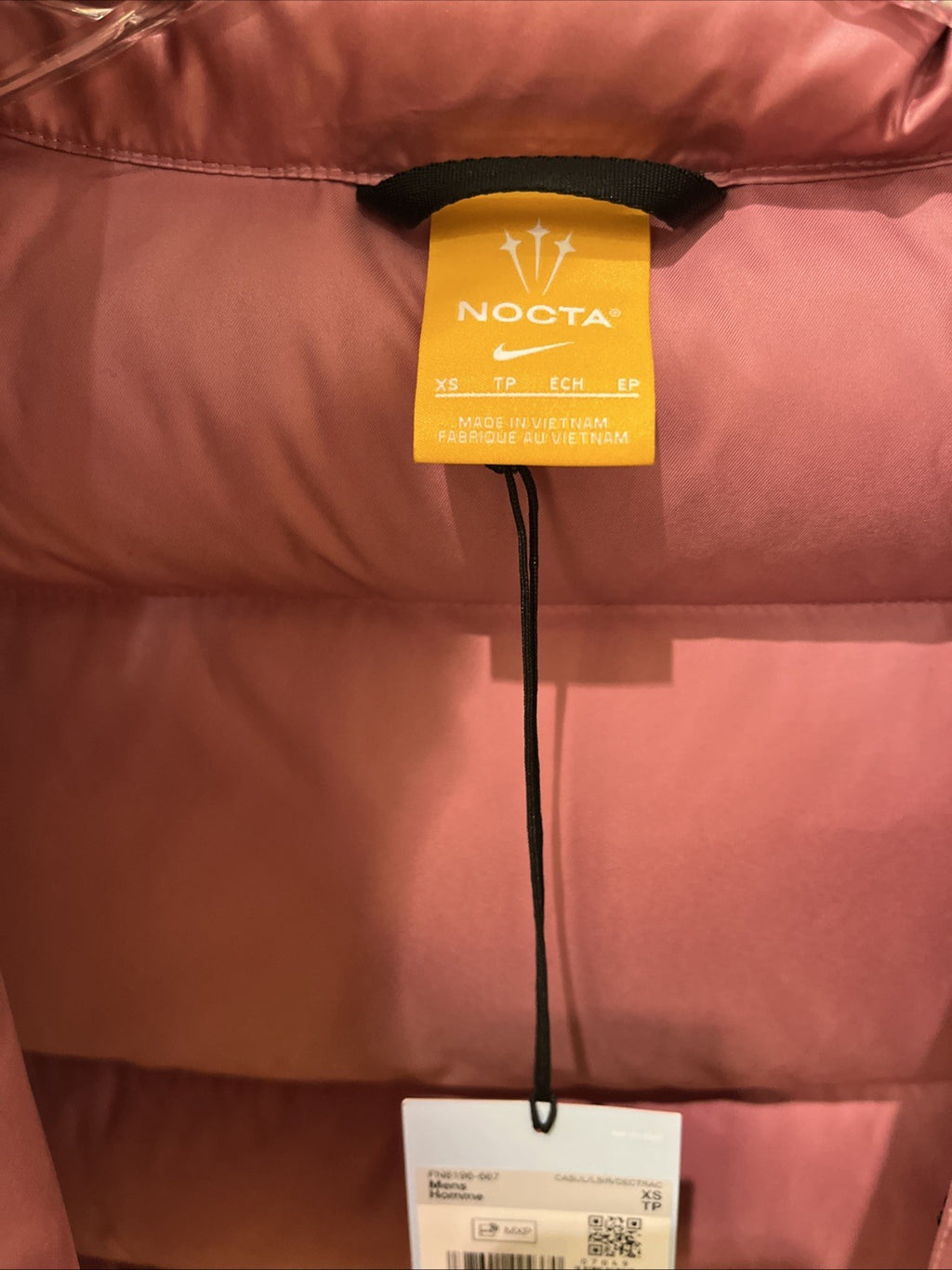 The Nike x NOCTA Sunset Puffer Jacket in size XS is a stylish and fashionable outerwear option for men. Made of polyester with a 700 warmth weight, this mid-length jacket features a stand-up collar, full zip closure, and a solid Desert Berry color. Perfect for casual occasions in winter, it offers a comfortable fit and is accented with zipper details. The jacket is part of the Nike x NOCTA product line, featuring themes of Nike Air, Nocta, Travis, Ovo, and Drake. Made in Vietnam, this puffer jacket is ideal for walking, cycling, or golfing in cold weather.