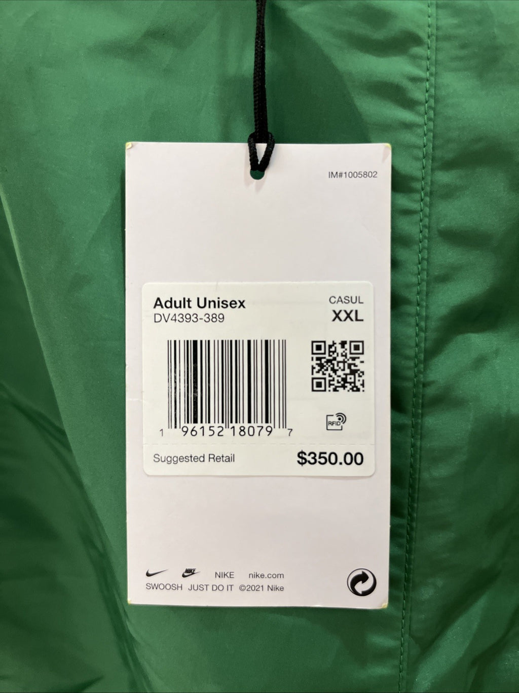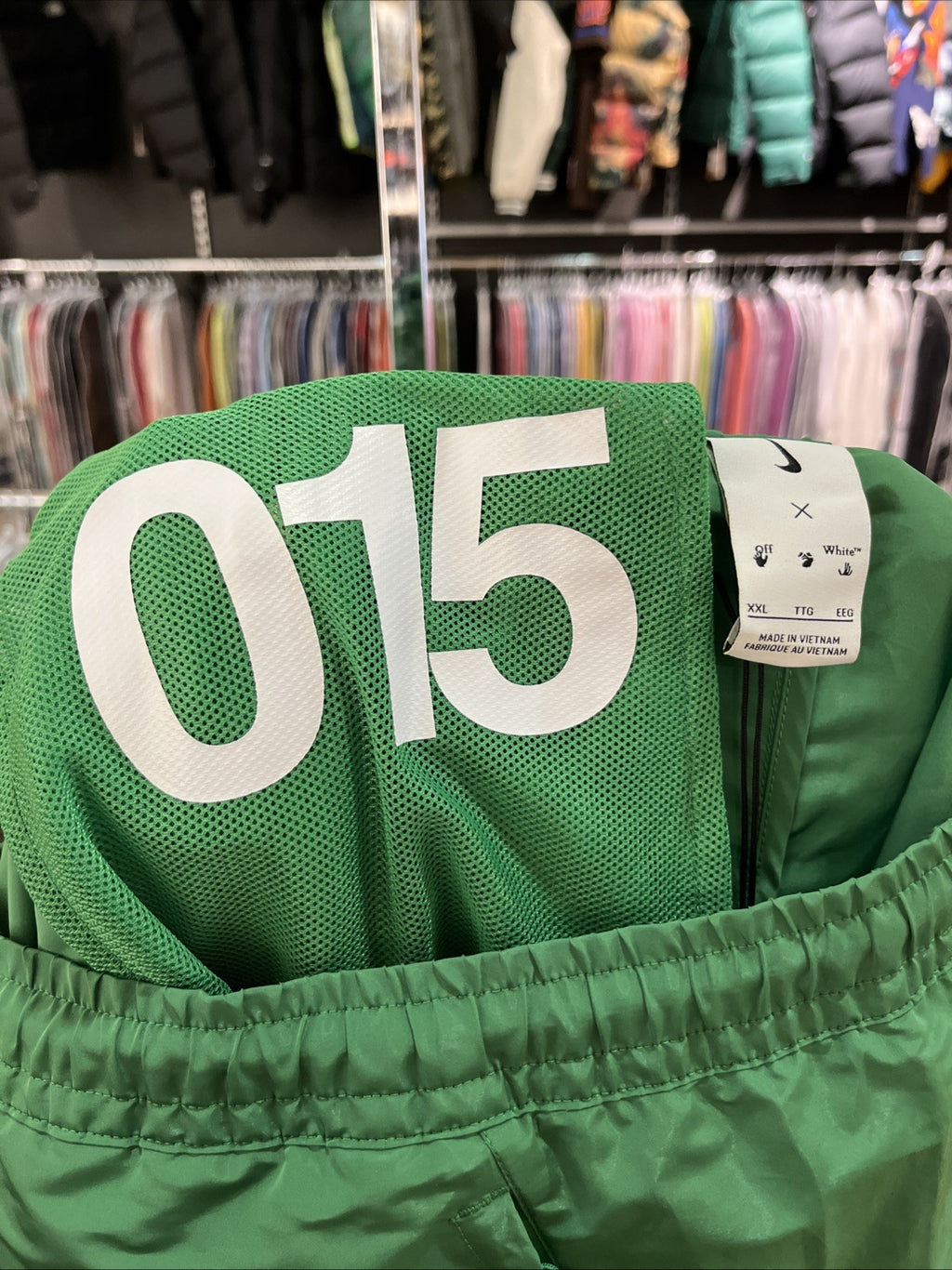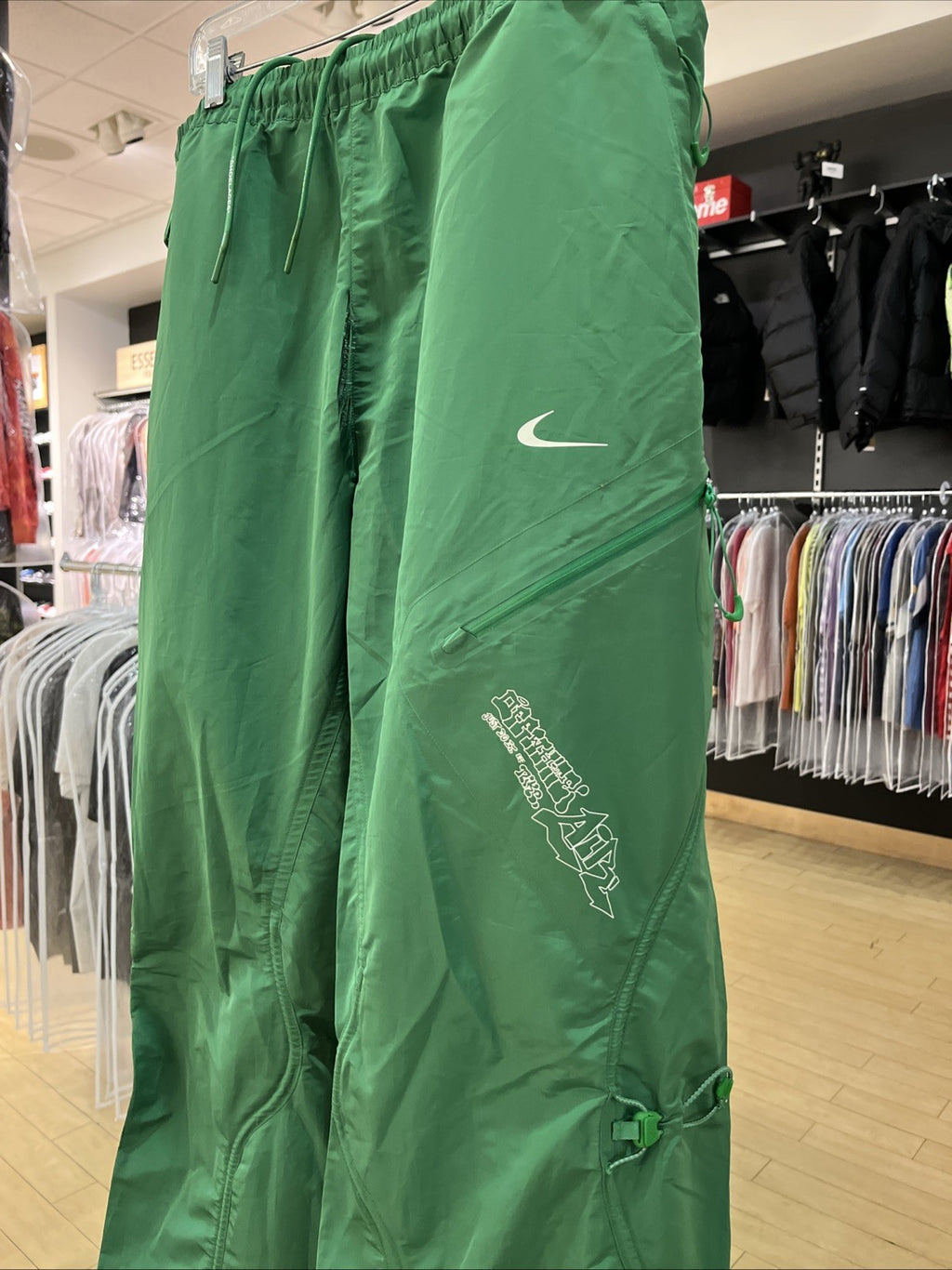 The Nike x Off-White Pants in green are unisex track pants designed for activewear. Made of polyester with a relaxed fit, these wide-leg pants feature a comfortable design perfect for casual occasions. The garment care is machine washable, making it easy to keep them clean and ready to wear. The Nike x Off-White collaboration adds a stylish touch to these versatile pants, making them a great addition to any wardrobe for those who appreciate quality and fashion in their activewear.