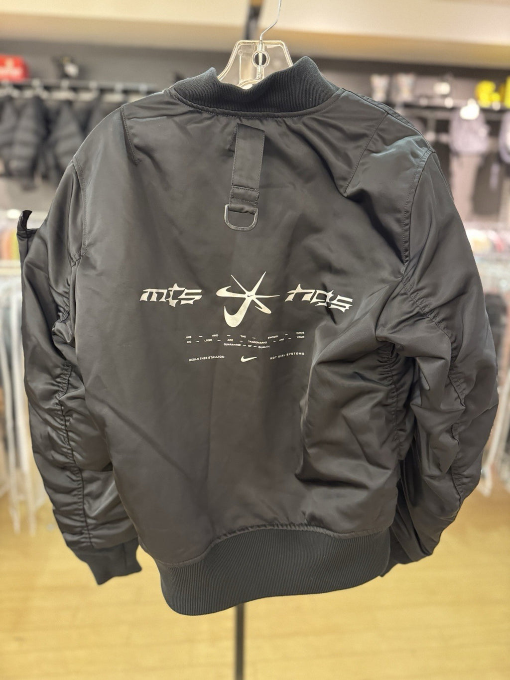 The product is a Nike x Megan Thee Stallion Full Zip Black Men's XS Bomber Jacket. It features a solid black design with a zip closure, making it suitable for casual wear and travel occasions. The jacket is lined and includes zipped pockets for added convenience. Made of nylon, it offers a regular fit and is ideal for all seasons. The collaboration with Megan Thee Stallion adds a unique touch to this stylish and versatile bomber jacket from Nike.