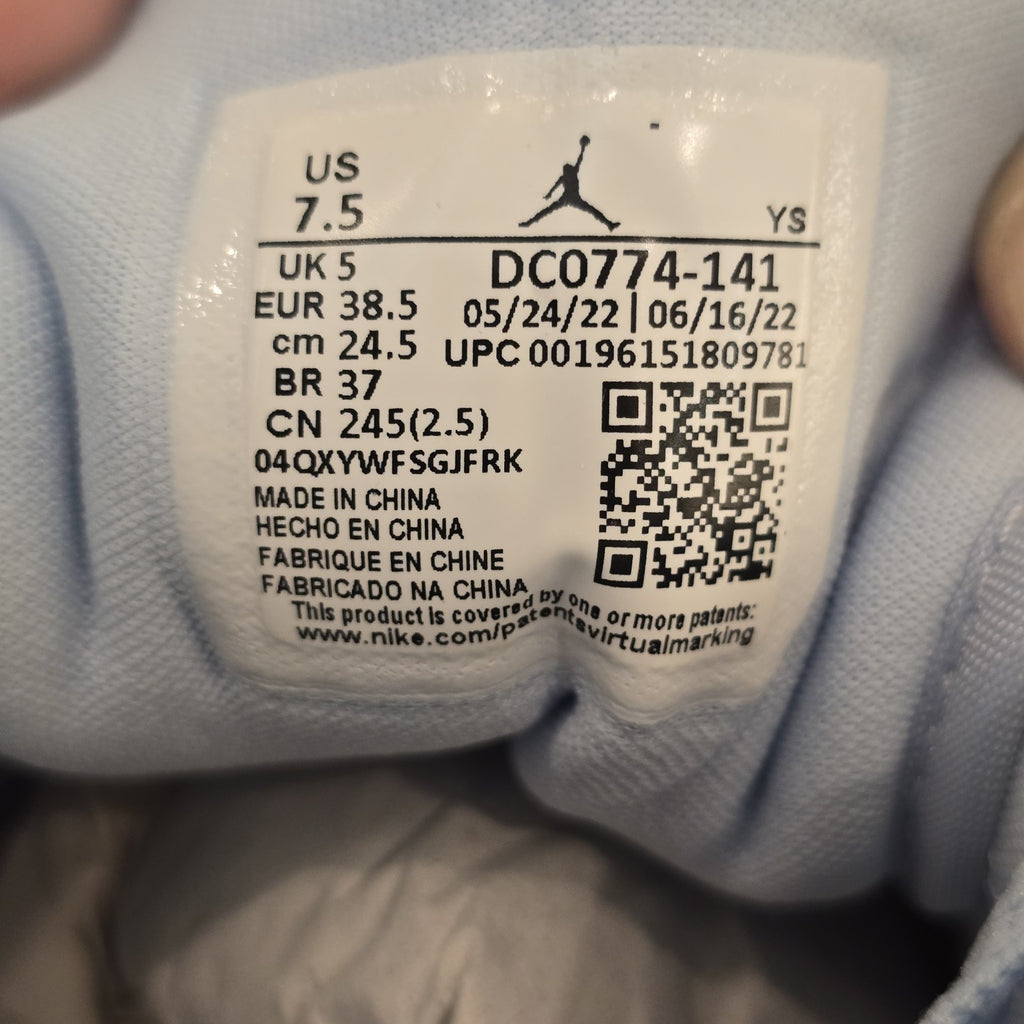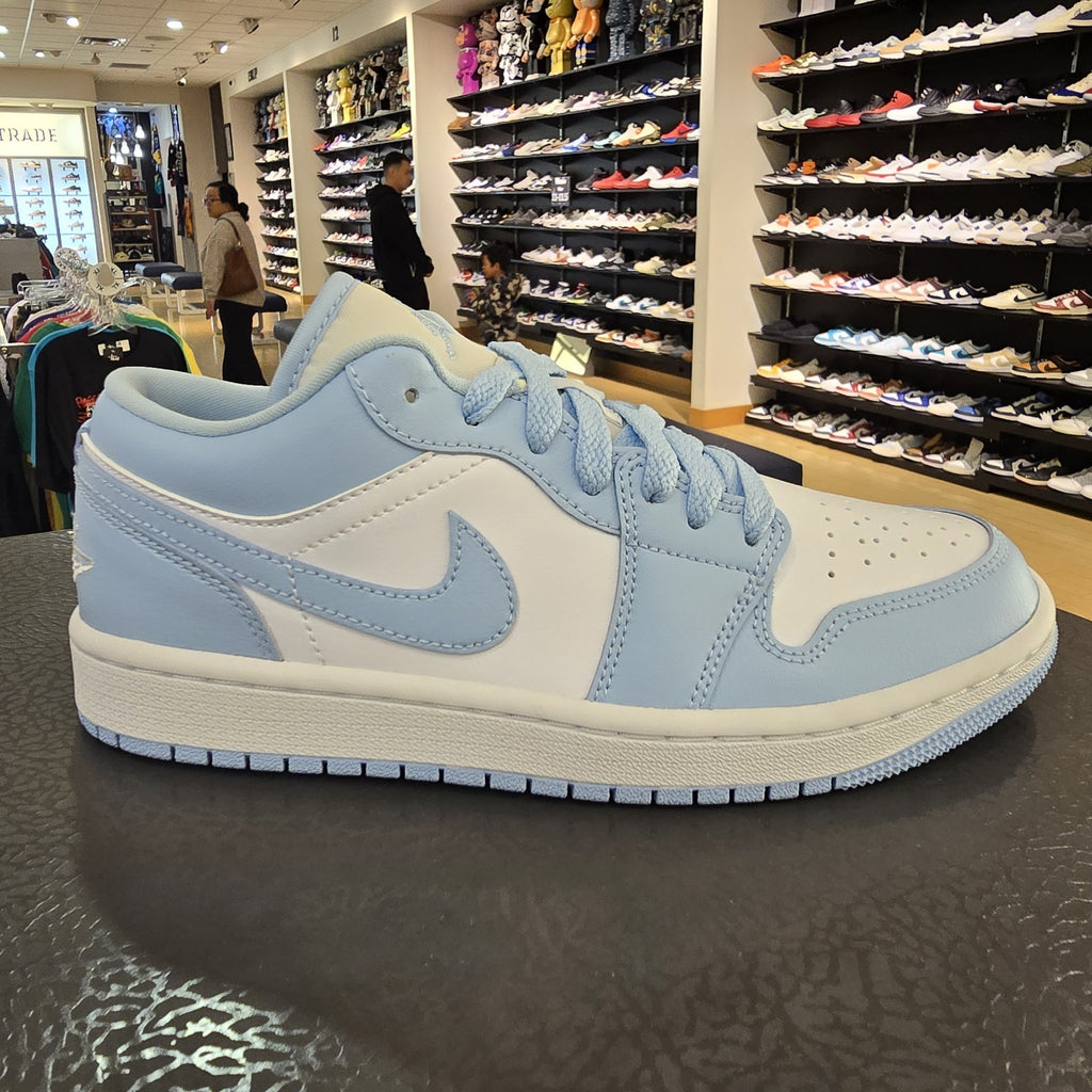 The product is a Women's Air Jordan 1 Low Ice Blue sneaker in size 7.5. It features a lace-up closure, leather upper material, rubber outsole, and comfortable insole. This athletic shoe is part of the Air Jordan product line and is suitable for activewear occasions in the summer, fall, and spring seasons. The color is a solid blue with logo accents, and it is designed for lifestyle performance activities. The shoe is a modern style with a low top design and adjustable features.