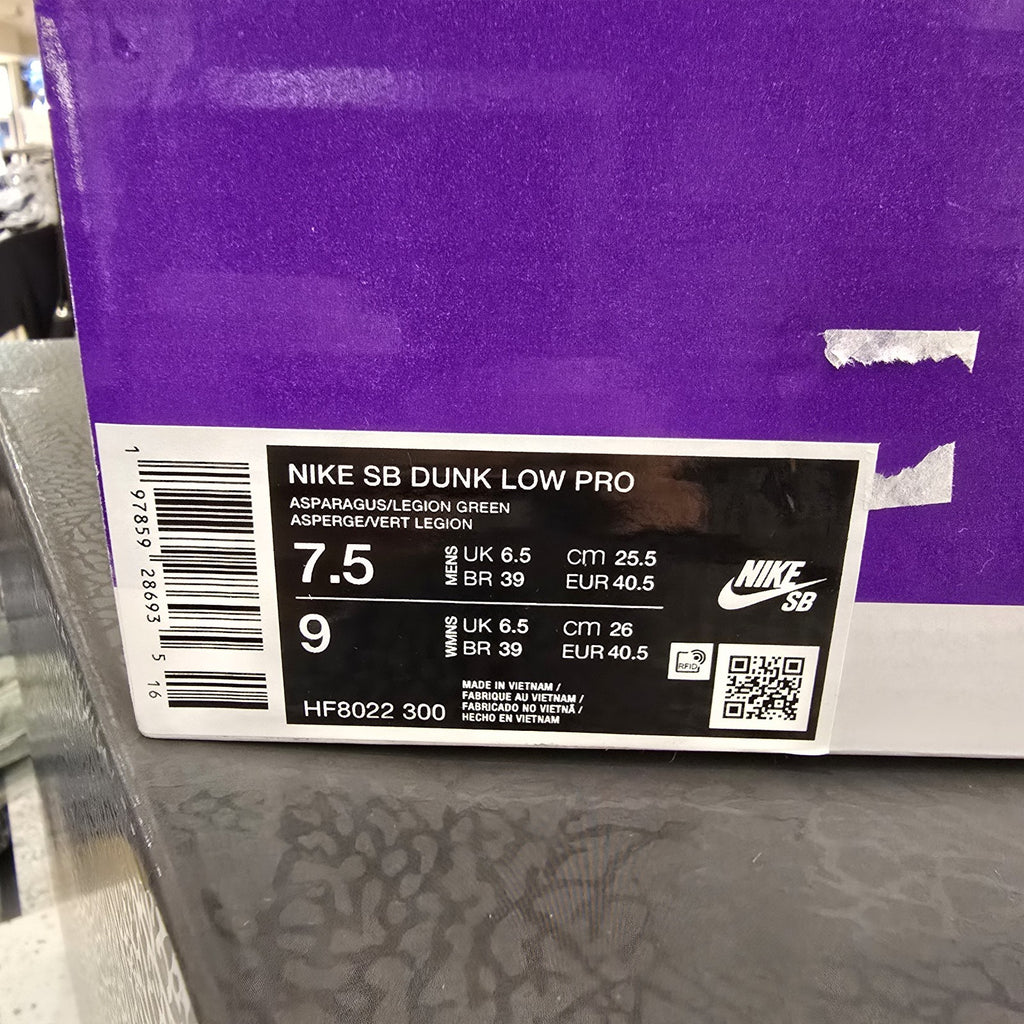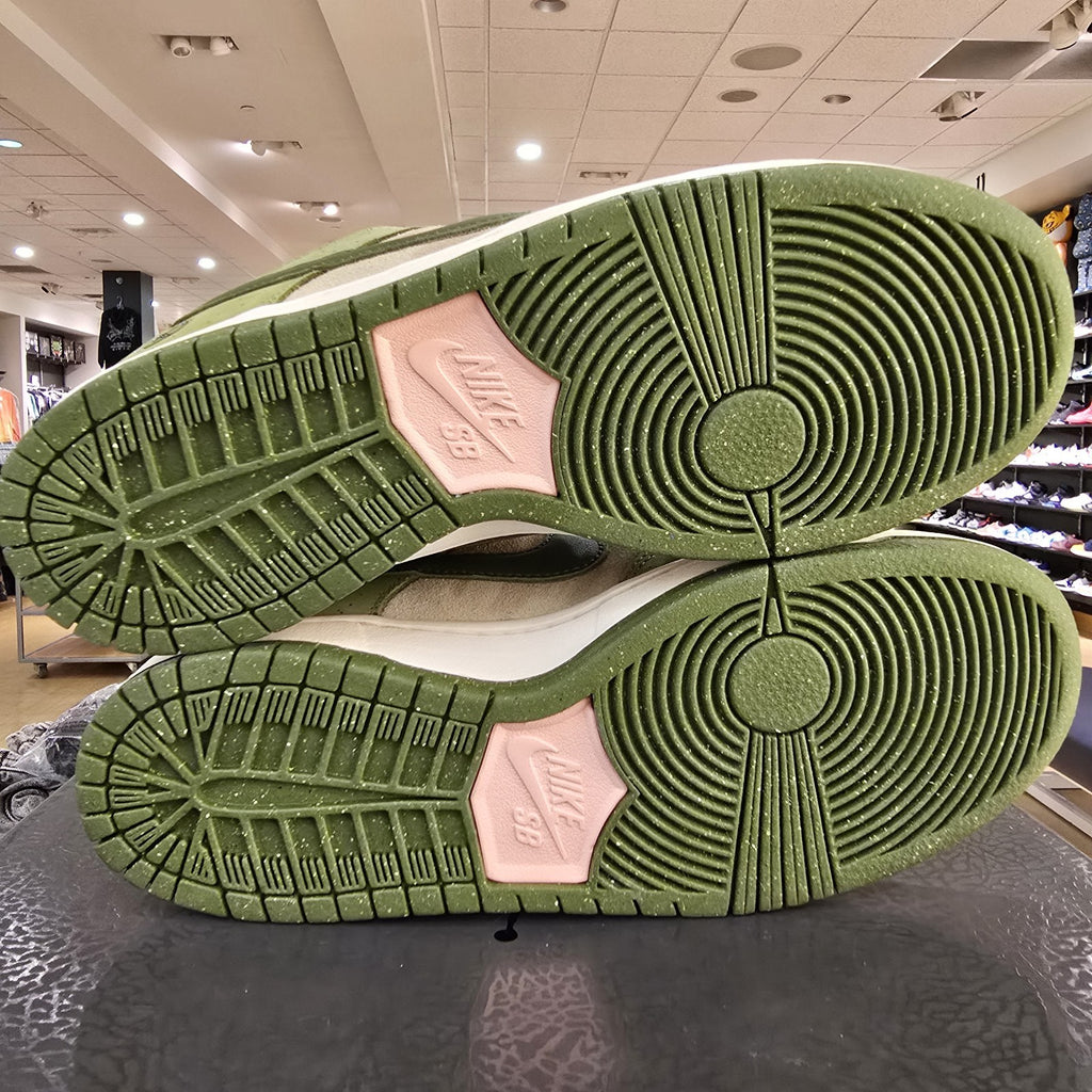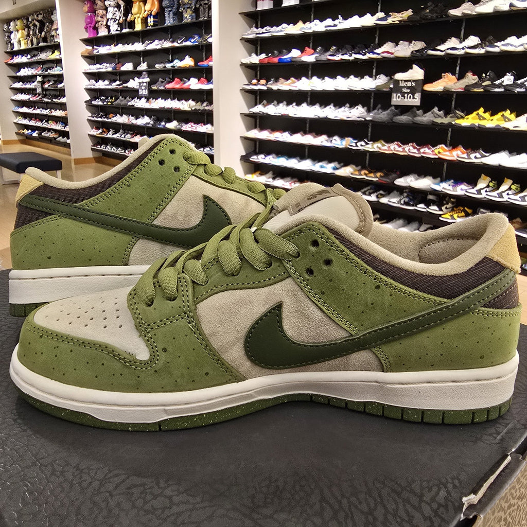 The product is a Size 7.5 Yuto Horigome x Nike Dunk SB Low in Matcha green color. This shoe features a low top design with a suede upper material, part of the Nike Dunk product line. The style code for this athletic sneaker is HF8022-300 and it is a collaboration between Nike and professional skater Yuto Horigome. It is designed for men and was released in 2025. The unique design and limited availability make it a sought-after item for sneaker enthusiasts and collectors.