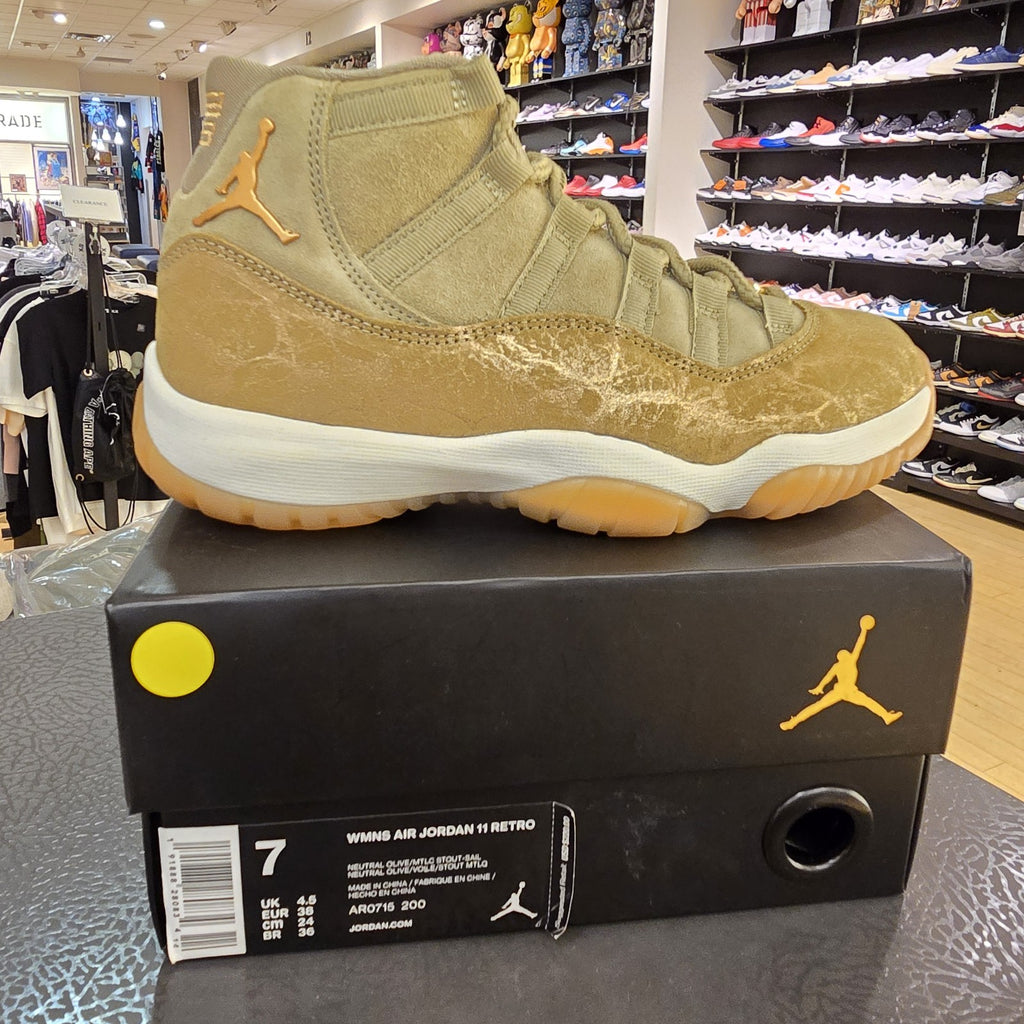 The product is a women's size 7 Air Jordan 11 Retro Neutral Olive Lux sneaker by the brand Jordan. This athletic shoe features a brown colorway and belongs to the Air Jordan product line. Released in 2018, this model (AR0715-200) showcases the iconic Air Jordan 11 silhouette, perfect for sneaker enthusiasts looking for a stylish and comfortable option for sports or everyday wear.