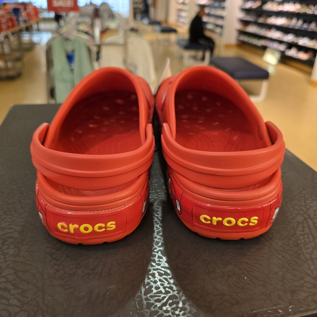 The product is a size 7 Crocs Classic Clog featuring Lightning McQueen, a popular character from the animated movie "Cars." This red clog is designed specifically for men and made of rubber, offering a comfortable and casual style for everyday wear. Perfect for fans of Lightning McQueen and those looking for a unique and fun addition to their shoe collection.