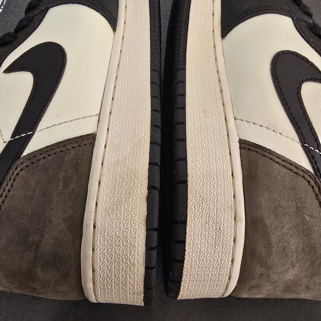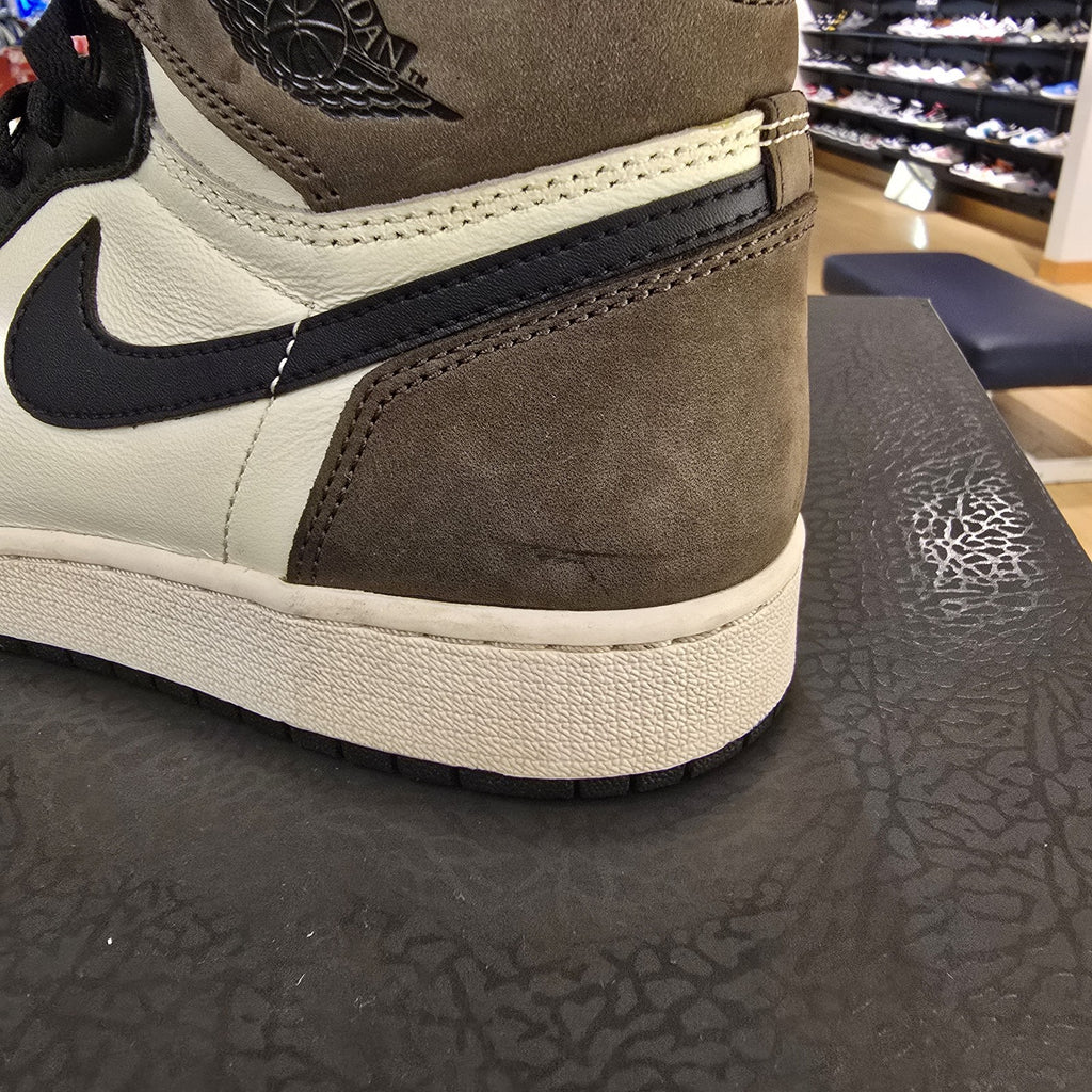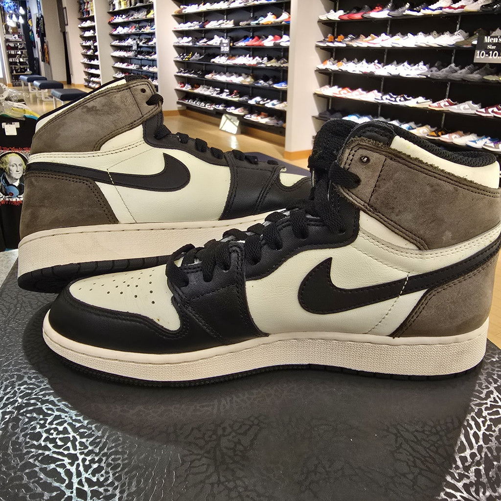 The product is a pair of Jordan 1 Retro OG High Dark Mocha GS sneakers in size 7Y. These high top sneakers feature a brown colorway with the iconic Air Jordan 1 silhouette. Part of the Air Jordan product line, these athletic shoes were released in 2020 and are designed for men. The style code for this model is 575441-105, making it a sought-after option for sneaker enthusiasts looking to add a classic Jordan shoe to their collection.