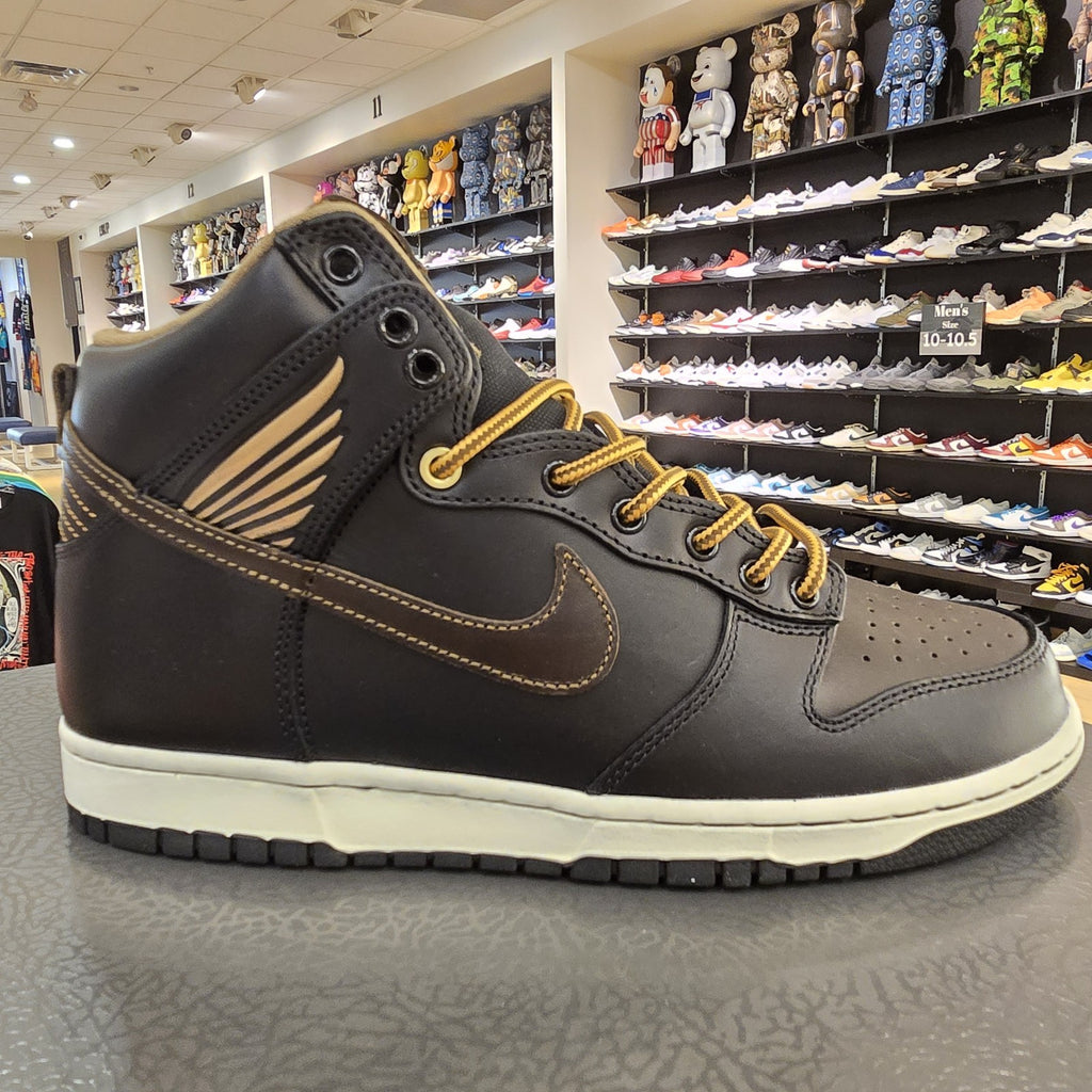 The product is a pair of Nike Dunk SB High Old Soul sneakers in size 9.5. This collaboration with Pawnshop features a high-top shoe shaft style in a brown color, made of leather material. Released in 2023 as part of the Nike Dunk product line, these athletic shoes are designed for men and embody a sneaker style that combines classic elements with modern details, making them a sought-after addition to any sneaker collection.