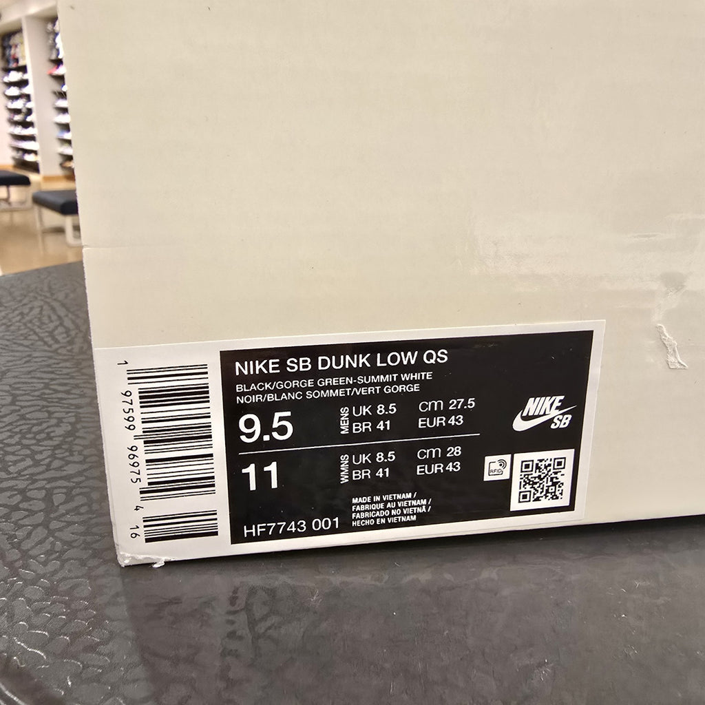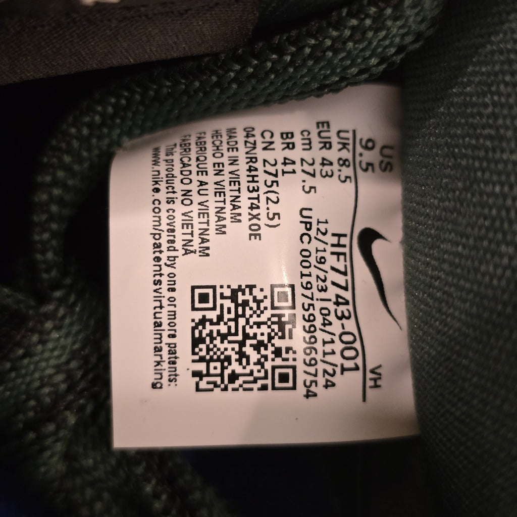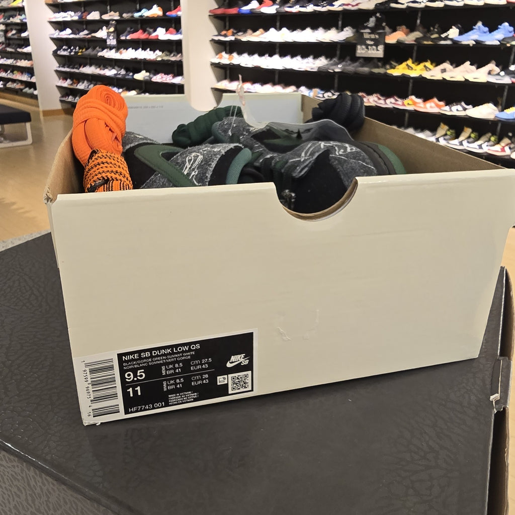 The product is a size 9.5 shoe featuring a low top style, designed by collaboration between THERE Skateboards and Nike Dunk SB. This sneaker is part of the Nike Dunk product line and is specifically designed for skateboarding performance. Made with suede upper material, the shoe is in a sleek black color and is released in 2024. With the style code HF7743-001, this athletic shoe is ideal for men who enjoy skateboarding and are looking for a high-quality and stylish footwear option.