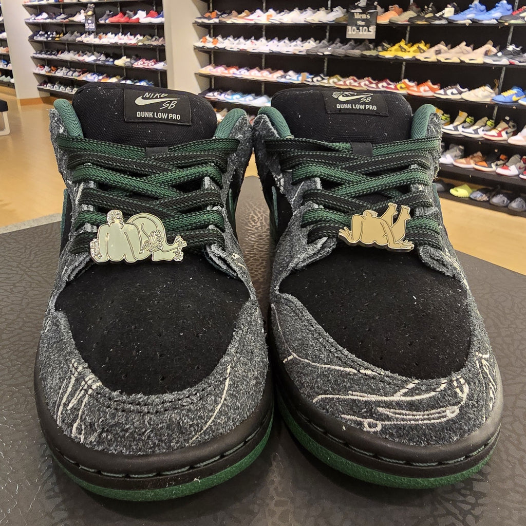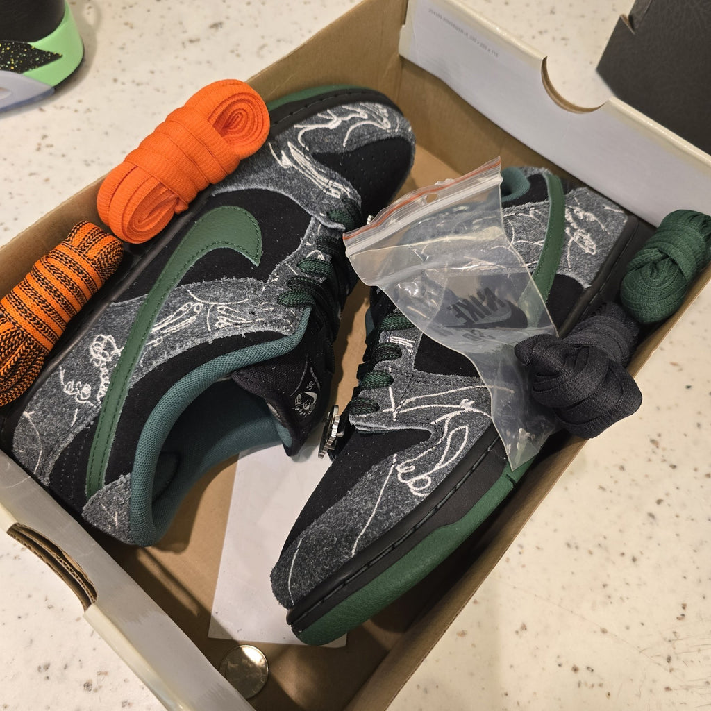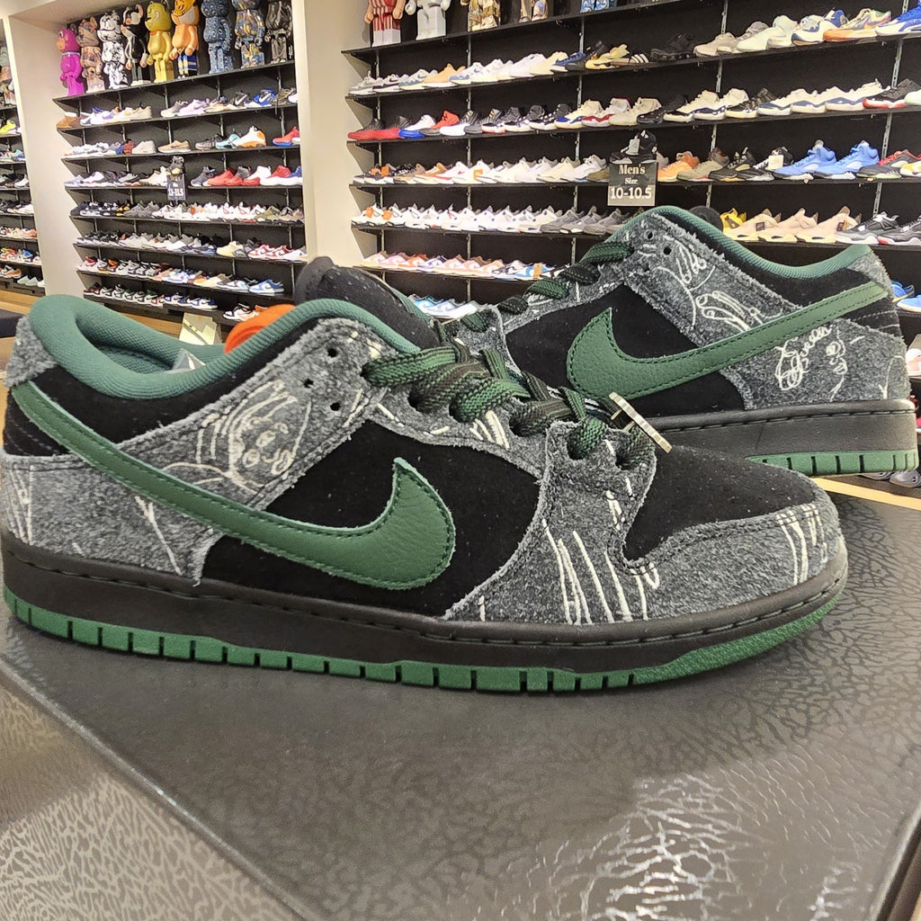 The product is a size 9.5 shoe featuring a low top style, designed by collaboration between THERE Skateboards and Nike Dunk SB. This sneaker is part of the Nike Dunk product line and is specifically designed for skateboarding performance. Made with suede upper material, the shoe is in a sleek black color and is released in 2024. With the style code HF7743-001, this athletic shoe is ideal for men who enjoy skateboarding and are looking for a high-quality and stylish footwear option.