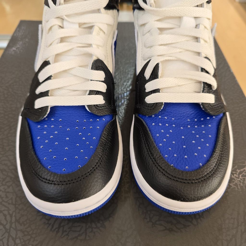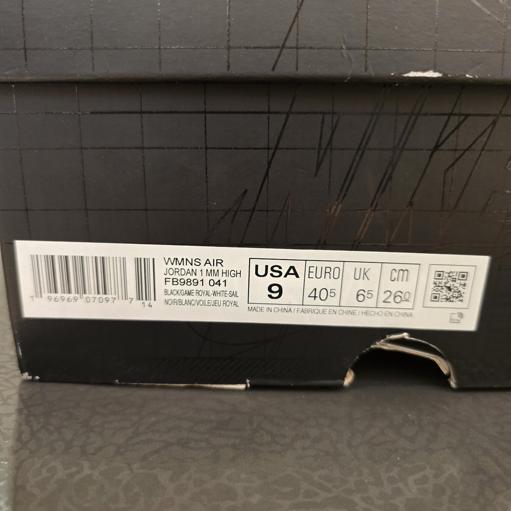 The product is a women's size 9 Air Jordan 1 High Royal Toe sneakers by Jordan. The shoes feature a high-top design with a white color and leather upper material. They belong to the Air Jordan product line and are designed as athletic shoes for women. The style code for this model is FB9891-041, making it a stylish and comfortable choice for sneaker enthusiasts looking for a blend of classic and modern design elements.