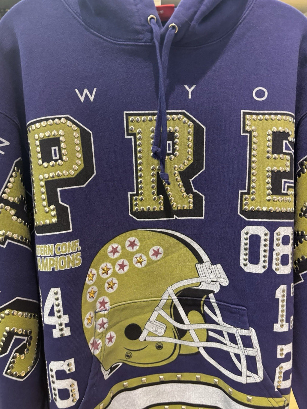 The Supreme Champions Studded Hooded Sweatshirt is a stylish pullover sweatshirt designed for men. Made by the popular brand Supreme, this purple sweatshirt features a hood and studded accents, adding a trendy and edgy touch to the classic design. With a regular fit and size M, this sweatshirt is perfect for men looking to make a statement with their activewear.