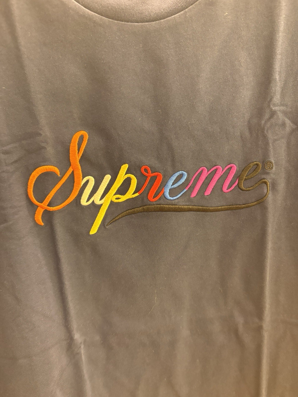 The product is a men's Supreme Cursive S/S Top in navy blue, size large. This t-shirt features a regular fit and is part of the Supreme brand's line of clothing. The design of the top includes a cursive print, adding a unique and stylish touch to the classic navy blue color. Perfect for those looking to add a touch of streetwear flair to their wardrobe.