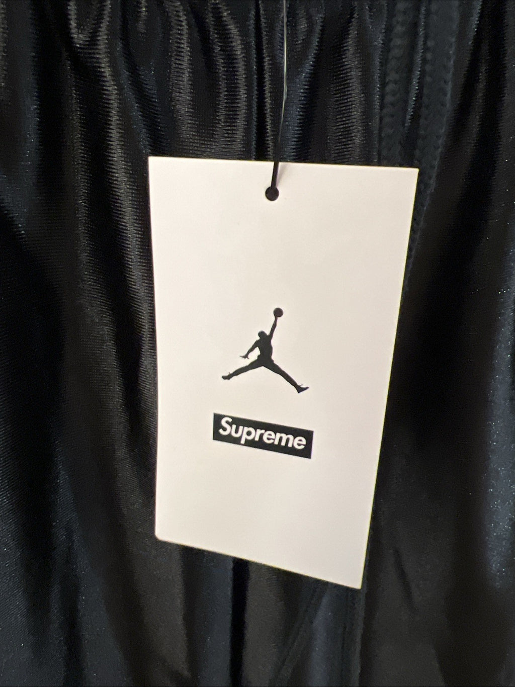 The product is a pair of Supreme Jordan Warm Up Shorts in black, size XL. These shorts are designed for men and made of polyester material. The style of the shorts is a warm-up style, perfect for casual wear or working out. The brand, Supreme, is known for its high-quality and fashionable clothing items, making these shorts a stylish and functional addition to any wardrobe.