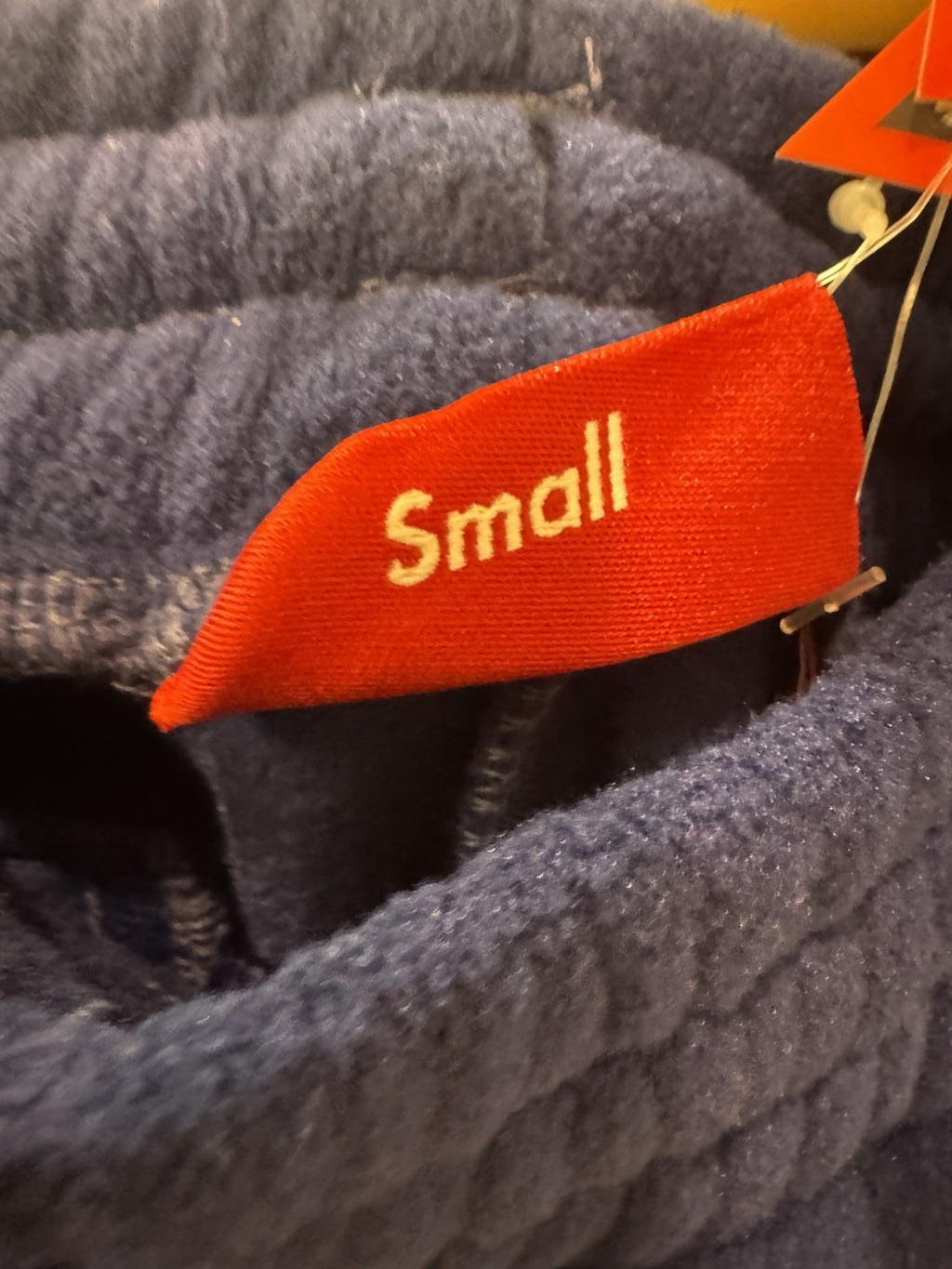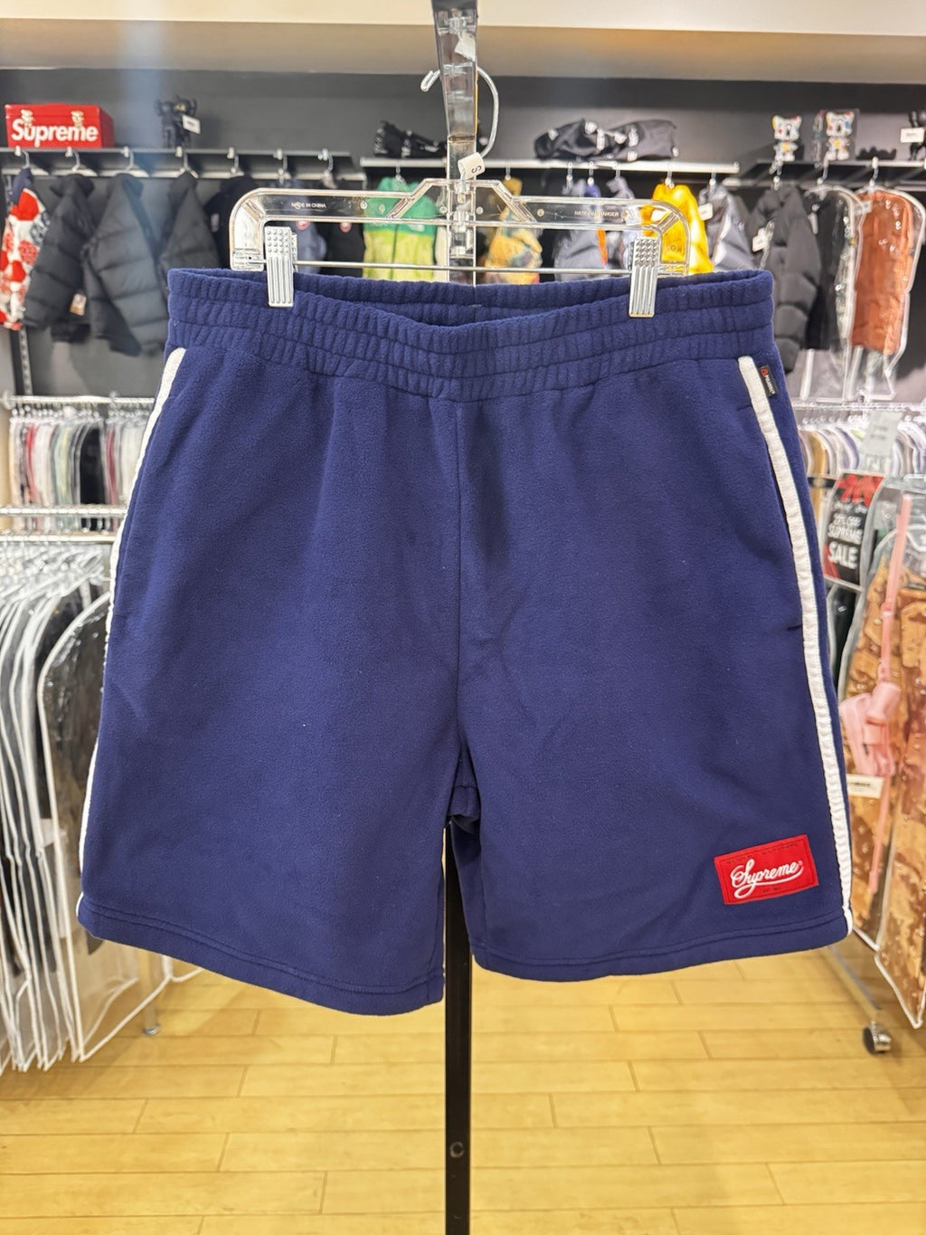 The product is a pair of Supreme Polartec shorts in navy blue, size small. These shorts are designed for men and feature a regular fit. The Polartec material provides comfort and durability, making them suitable for various outdoor activities or casual wear. The classic blue color and Supreme brand add a stylish touch to the overall look of the shorts. Perfect for adding a sporty and trendy element to any outfit.