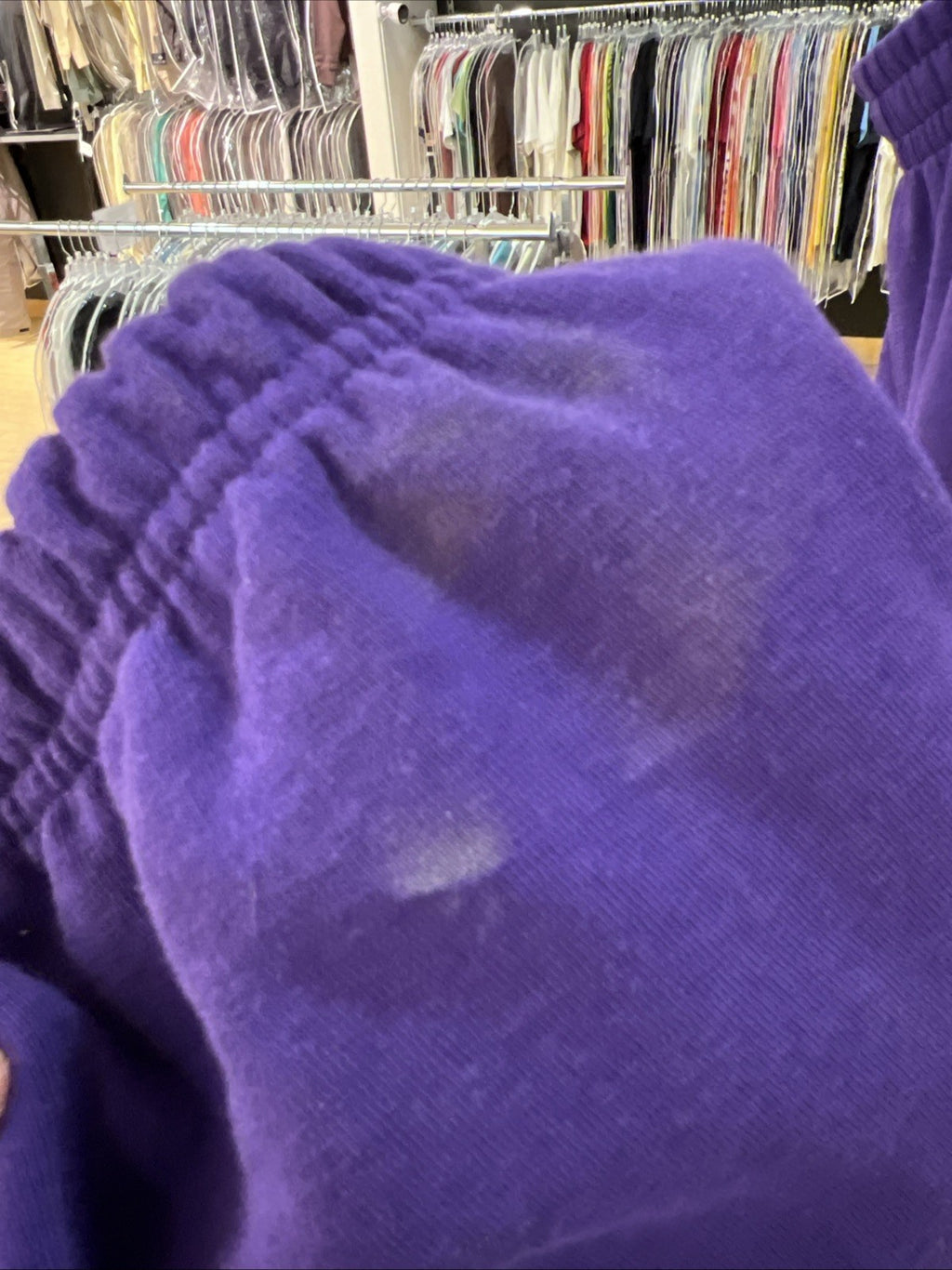 The Supreme Raised Script Sweatpant in Purple, size Large, is a stylish and comfortable pair of activewear pants. Made of cotton, these sweatpants feature a drawstring closure, pockets, and a logo theme. Perfect for fall and spring seasons, these machine washable pants bear the signature Supreme brand, making them a must-have for any fashion-forward man looking for a trendy yet practical addition to his wardrobe.
