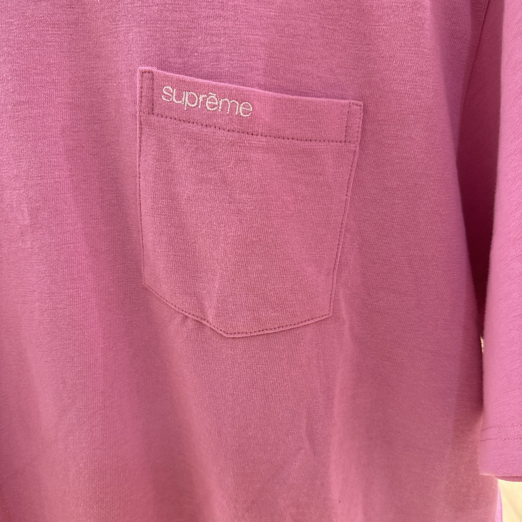 The product is a Supreme S/S Pocket Tee in bright pink, size XL. This t-shirt is designed for men and features a regular fit with a pocket detail. Supreme is a renowned brand known for its high-quality streetwear apparel, making this tee a stylish and durable addition to any wardrobe.