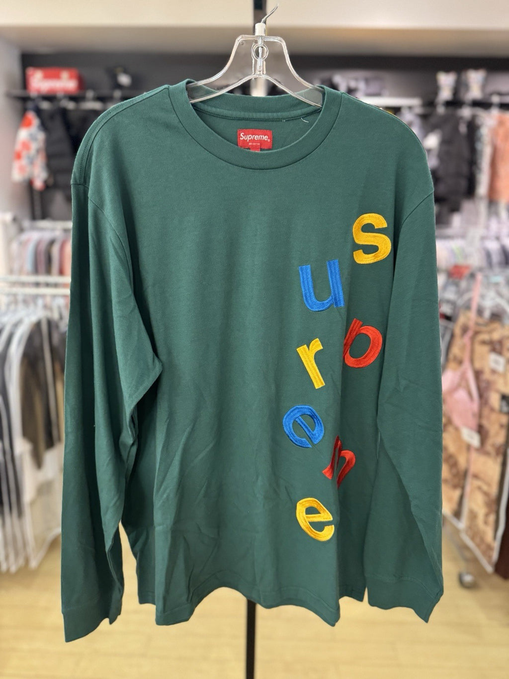 The product is a Supreme Scatter Logo Long Sleeve Top in dark green, size medium. It is a men's regular fit t-shirt featuring the iconic Supreme logo as an accent. Made by the popular brand Supreme, this t-shirt is a stylish addition to any wardrobe for those looking to showcase their love for the brand's unique aesthetic.