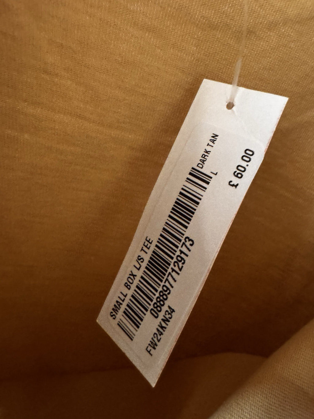 The product is a Supreme Small Box Long Sleeve Tee in Dark Tan, size L. This T-shirt is designed for men and features a beige color with a box theme. Made by the well-known brand Supreme, this tee offers a regular fit and is a stylish addition to any man's wardrobe.