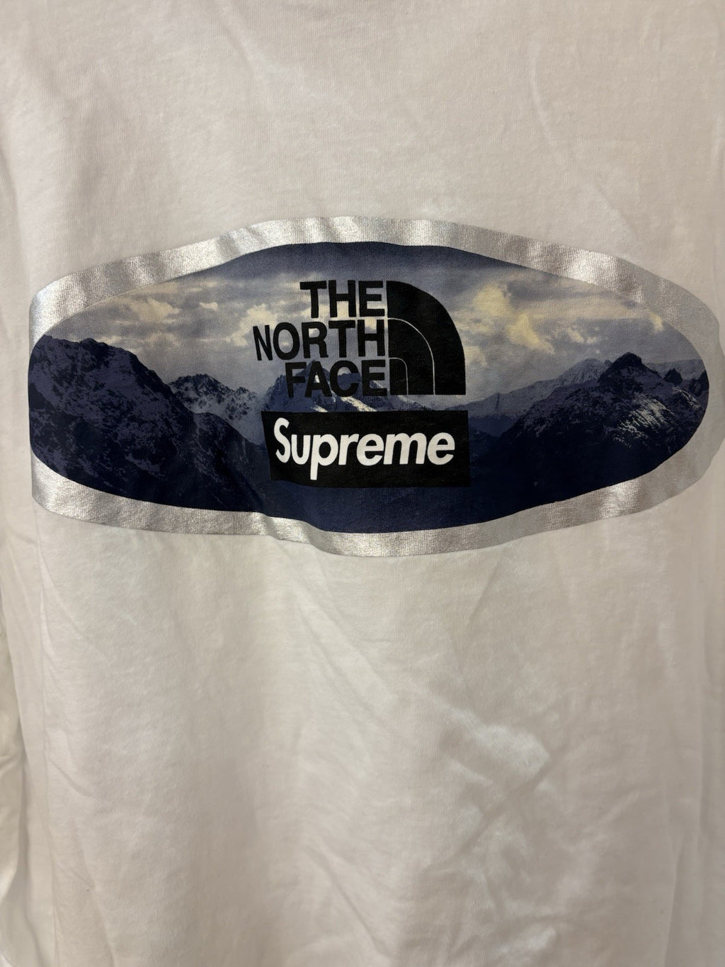 The Supreme The North Face Mountains Tee in white, size XL, is a stylish and comfortable t-shirt for men. Featuring the iconic North Face mountains graphic, this tee is made by the renowned brand Supreme. The regular fit and high-quality material make it a versatile and trendy addition to any wardrobe. Perfect for casual wear or layering, this t-shirt is a must-have for any fashion-forward individual.